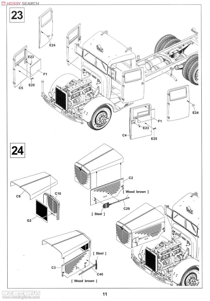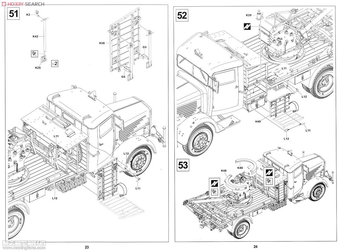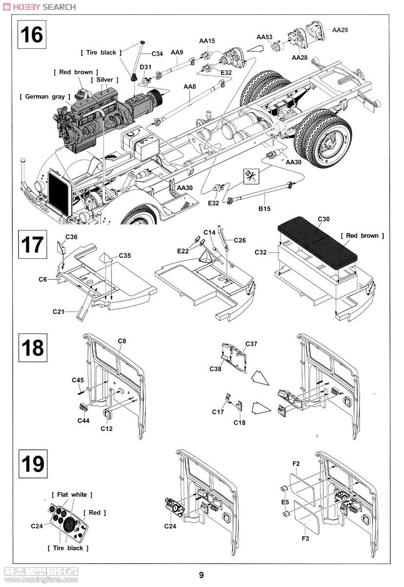 AFVCLUB的这款卡车是今年推出的新品,其实所谓的“新”只是吊车和储物箱部分,其余的板件都是和自家的L4500A通用,其详细评测小站也有,有兴趣的模友可以自己翻看一下。就板件来说,材质偏脆,全内购,开模合理,水口很小,细节锐利,货仓木纹效果刚好,橡胶轮胎有轻微的合模线,花纹清晰,整体组合度也不差,附带的蚀刻片主要用于发动机进气口、车尾的牌照架和货仓部分,但是有些推出孔的位置很是恶心,飞边也有不少。小细节开的很贴心,像是发动机前部的进气口,发动机两侧的散热口全部镂空,开模水平很不错,手头紧的模友们可以不用另购蚀刻片了,直做的效果也是可以接受的。新开的吊车部分略显繁琐,但是完成后细节非常丰富,可以活动,有一定的可玩性。AFV卡车的口碑一向不错,相信这款也不会失望的。 板件图和说明书如下(部分来自HOBBY SEARCH):