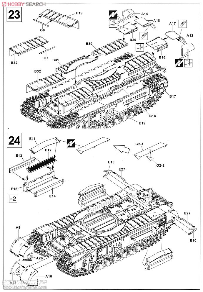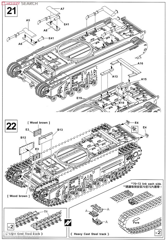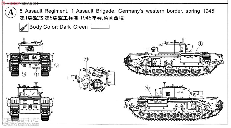AFVCLUB在2011年推出了这款丘吉尔,虽然这和丘吉尔是在老货的基础上新增零件重新包装的,但是凭借丘吉尔不错的质量和优秀的细节,AFVCLUB在丘吉尔这个领域足矣称霸一段时间了。在众多的丘吉尔当中,这盒丘吉尔还是很有特点的一款,这个型号的丘吉尔四装备了290毫米臼炮,发射40磅(18公斤)炮弹,内装28磅高爆弹头,可以一举摧毁敌军的防线,是不折不扣的拆屋能手。这盒丘吉尔四配备了活动悬挂和活动履带,除此之外还另外赠送了一套橡胶履带,2片蚀刻片,透明件,比较超值。质量方面也不必担心,AFVCLUB的丘吉尔一直都是其看家型号,大型准确,细节丰富,型号众多,足矣让其他模型厂商不愿再涉足此领域。炮塔开出了铸造感,全身铆钉干净锐利,细小的铸造编号非常清晰,自带弹簧式活动悬挂和活动履带,虽说弹簧硬了一点,但是总体来说效果还不错。虽然说丘吉尔的路轮看起来有些令人崩溃,但是鉴于不错的组合度,做起来也不算繁琐,小编觉得还不必担心。 板件图和说明书如下(部分来自HOBBY SEARCH):