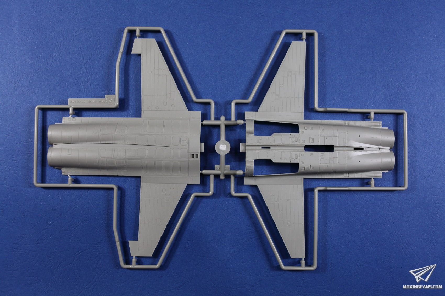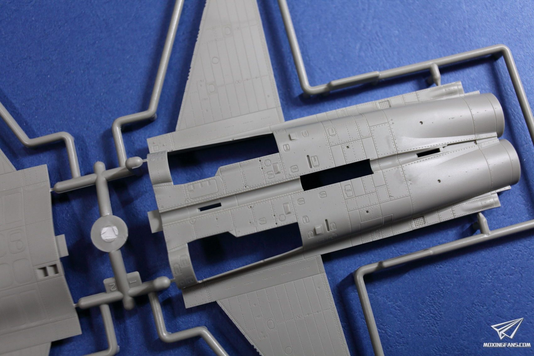 几块主要板件的情况,整体来说,板件整洁,开模合理,细节非常犀利,钉线完美。 透明件,中规中矩,说不上晶莹透亮,而且厚度比较薄,我其实很担心之后的打磨,万一用力大了一点真的有可能崩裂。座舱盖周围的一圈类似水口的设计给制作增加了难度,在修整时要非常小心以避免崩口和泛白的情况发生。 起落架细节,整体细节开的已经很到位了,且并不繁琐,如果追求细节的可以再追加一部分管线即可,但是很明显的,有一些部位有很大的缩水,都缩出一个眼子了。我一度还以为那个是一个管线的连接点呢。 尾喷细节,也算中规中矩吧,不过本来经国号的尾喷就没有苏式发动机尾喷比较明显的细节外露,而且值得称道的是,这里给出了尾喷的两种状态,虽然不是非常明显,不过这也看得出厂家的诚意。 垂直尾翼的细节,毫无疑问,考证对错我没法说,但是就从细节来看,已经是开的非常精致了。 即使是看不见的涡扇,也做的很到位。 前机身的开模,应该说,这次AFV对于这一块的开模还是很有水准的,一次成型,避免了这种大面积翼身融合组合可能产生的落差和缝隙,不过仔细看,在下方机翼的外侧部是有一定的缩水痕迹,而且是一个长条形,如果不能忍的还是补掉为好。