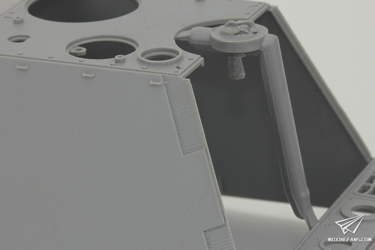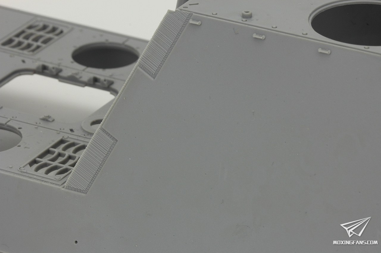 ▼ 但是其他部分的焊线和切割痕表现的就差强人意了,甚至还出现了少许飞边。另外,装甲表现制作了一些小坑细节,和之前的黑豹2类似,但是稀疏很不少,应该是用来还原轧制钢板的质感,但是表现的也不太让人满意。侧面的伪装物挂架套件只是开出了小型的突起,建议模友们切掉重做一下,效果会好很多。
