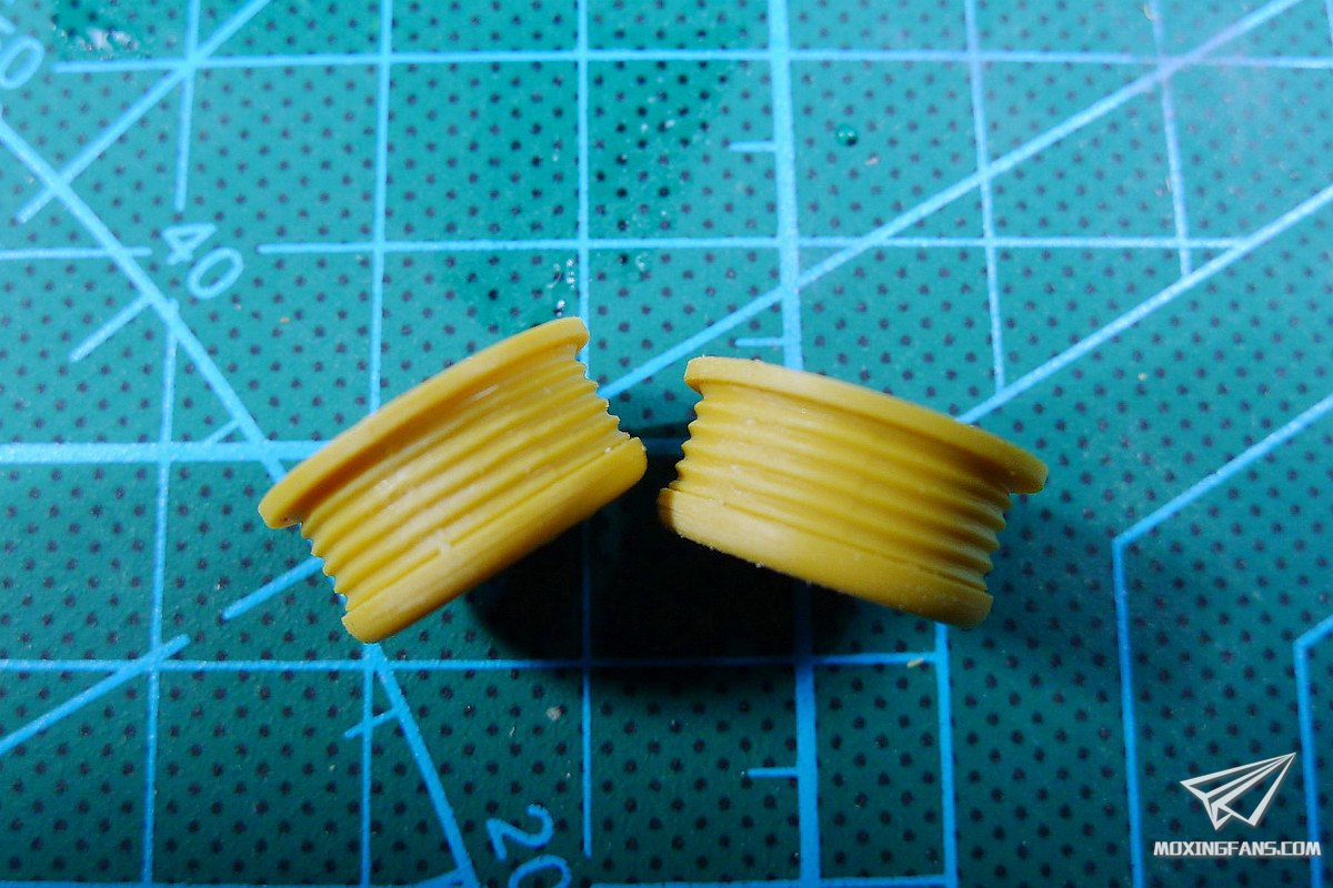 驱动轮的外部零件,这个就有点麻烦了,两根合模线落在了螺纹状的零件上,不清除肯定看不下去,所以只能用笔刀先刮,再用砂纸顺着螺纹凹槽仔细打磨。