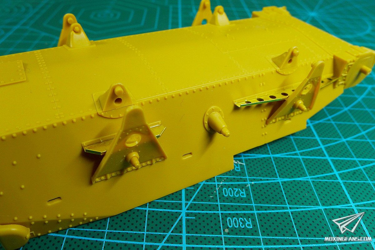 整个车子做下来唯一感到有组合误差的就是前面这块垂直装甲了,所以后面大家可以看到车头两侧我是用补土补了一下缝隙的,不过这个也可能是我装的问题,因为这种铆接装甲,只要有一块的前后顺序搭错,就有可能影响后面所有的组合度。除此以外,其他车身装甲的组合完全可以用极好来形容了。