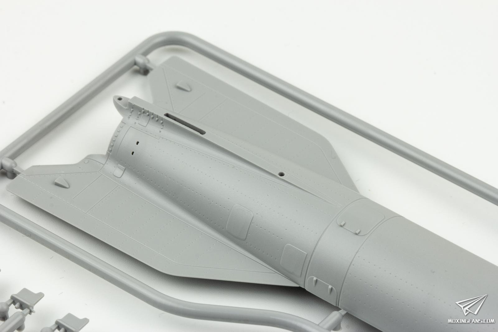 | ▼ 导弹本体为灰色PS塑料,两片式开模,凹钉凹线,钉子偏浅,刻线较为锐利。喷口为滑块开模,不需要拼合。