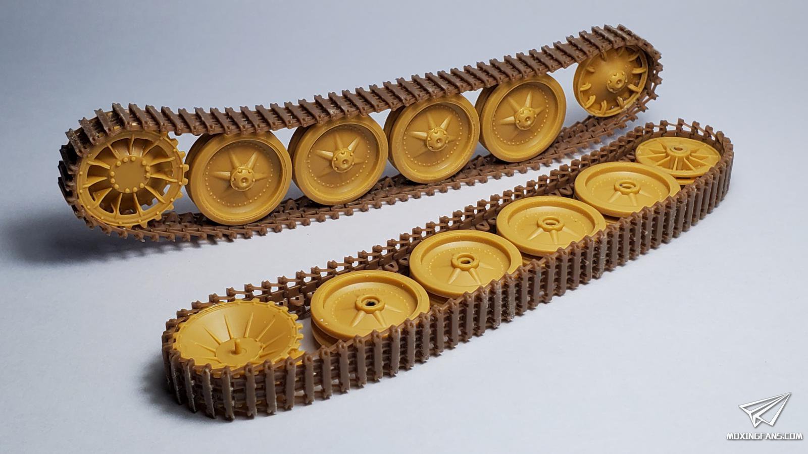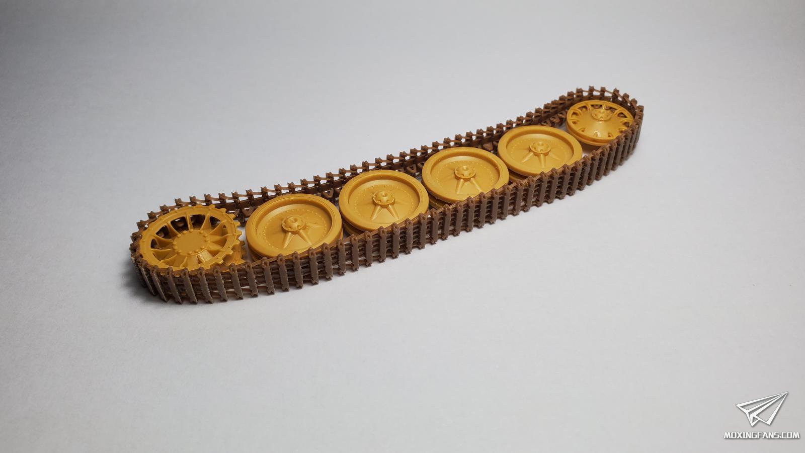 威骏这盒套件算是近年来的开模佳作,二战德军2号题材上的重要补充。总体来看本套件开模简练,分件合理,组合度上佳,零件组合定位方便,部分隐藏水口。 悬挂行走部分 本部分套件给出的悬挂式固定卡扣摇臂,组合度效果不错,只是路轮固定头还是偏松动,需要用蓝丁胶暂时假组固定。路轮将胶轮圈单独开出,合模线非常轻微,笔刀稍作处理即可,前主动轮组合时要主要按顺序。履带是拼接履带,镂空全部减重空,唯一问题是水口太多,修件工作量偏大。本部分还是采取了固定履带于整个路轮机构之上并与车体假组的方式方便后期上色。
