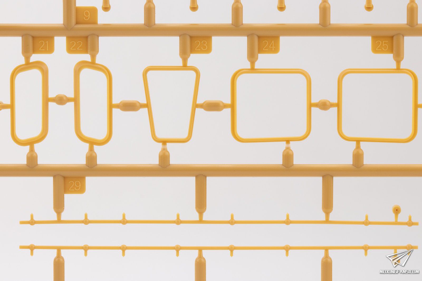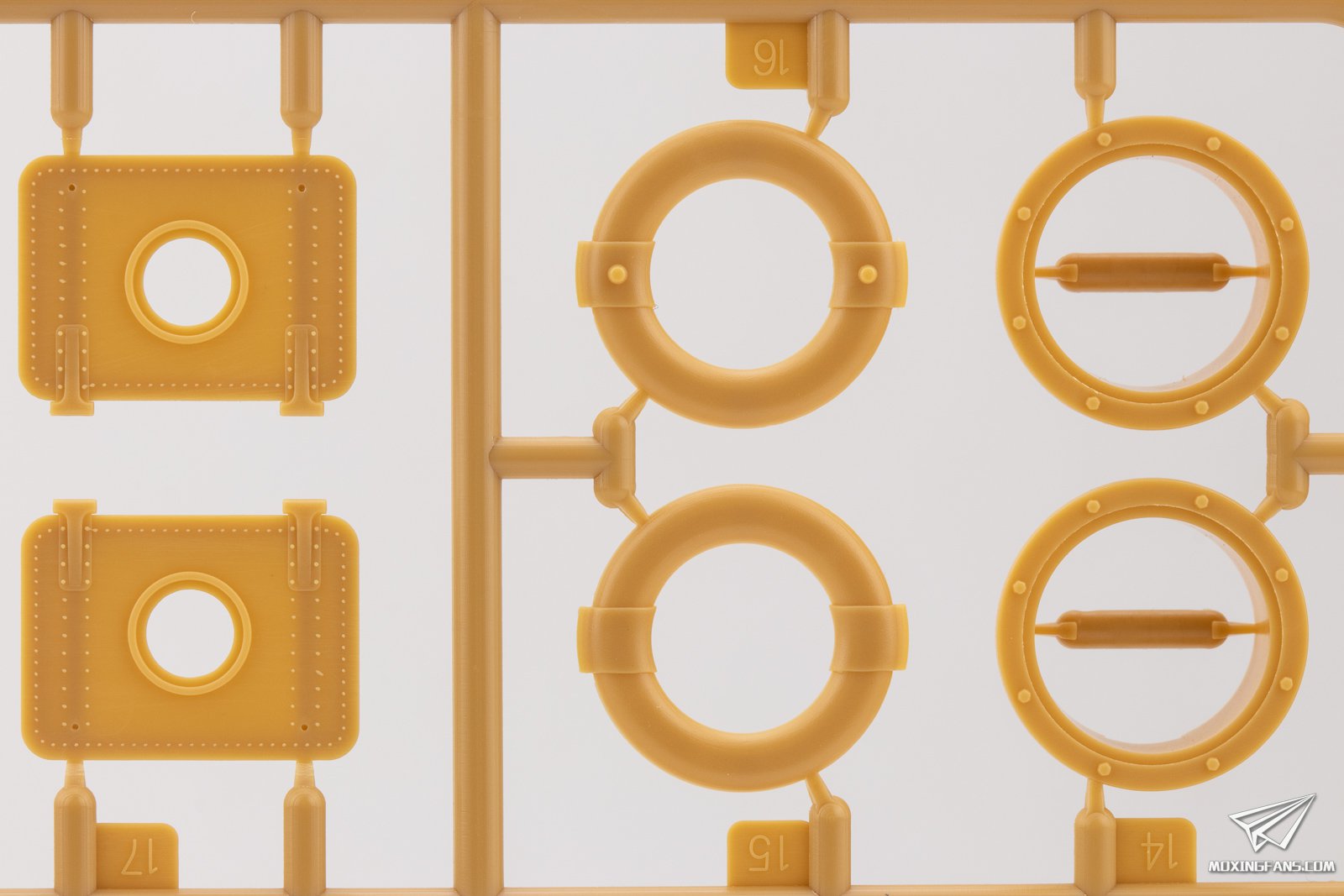 ▼ 这盒套件最有趣的地方就是悬挂部分,可选择使用中期型或后期型的悬挂,差不多算是一盒三合一的套件了。主体部分和之前评测过的两款基本一样,所以小编也不再赘述,仅展示新开部分。零件的细节表现和前作基本在同一水准,比较锐利,还附带一只小艇。