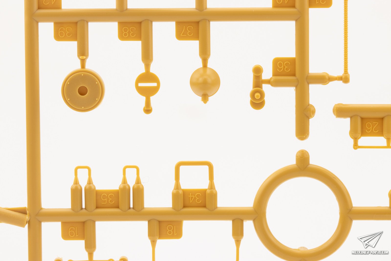 ▼ 行走部分细节丰富,主动轮开出了细小的铸造编号细节,前轮和负重轮的螺栓细节也比较锐利。履带为活动履带设计,接地面需要单独粘接。