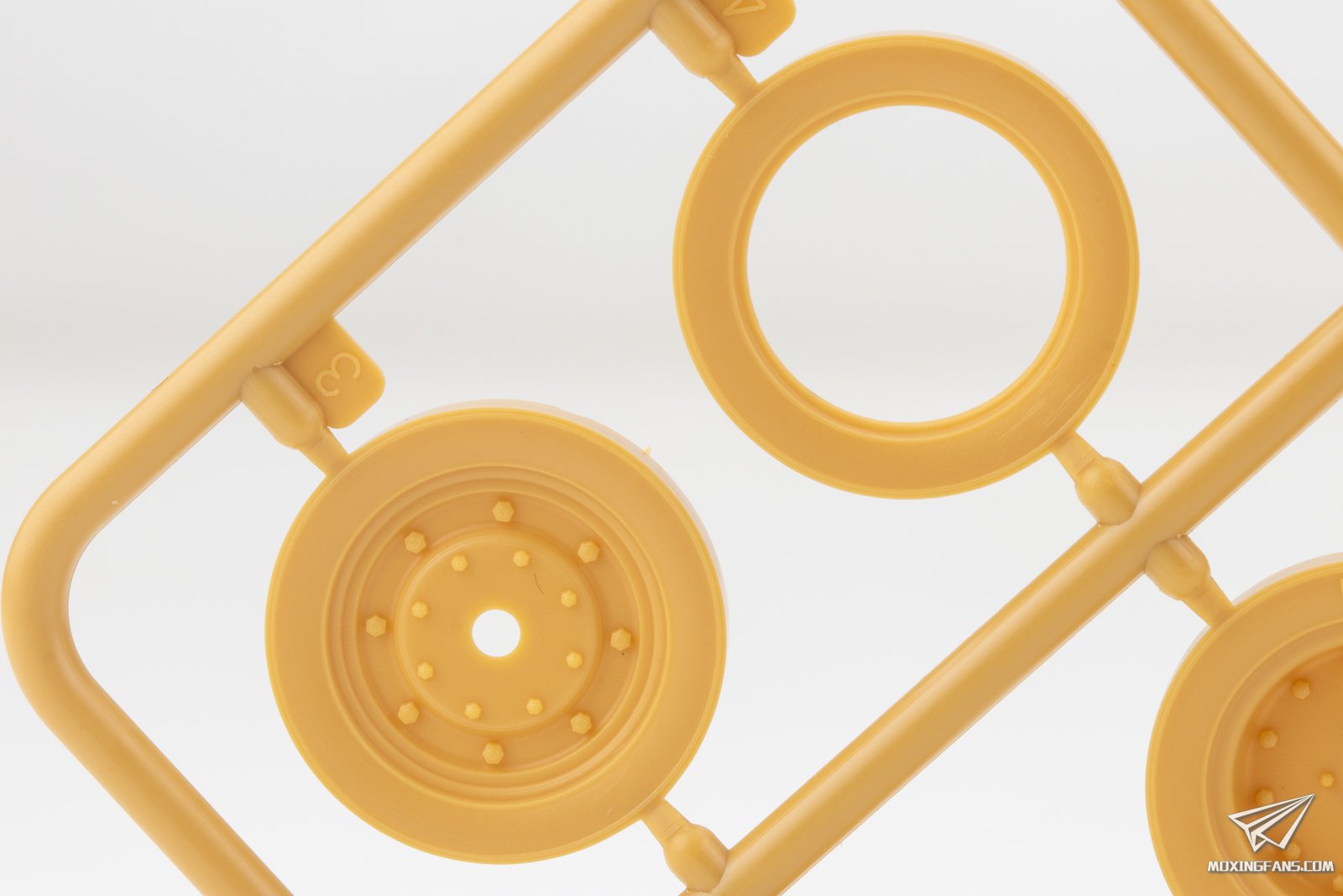 ▼ 悬挂等零件的细节。轮胎采用射出件表现,轮胎外圈需要和内圈单独粘接,轮胎接地面的花纹有少许错位。轮胎胎壁的文字细节有所表现,轮毂的螺栓表现的较为锐利。