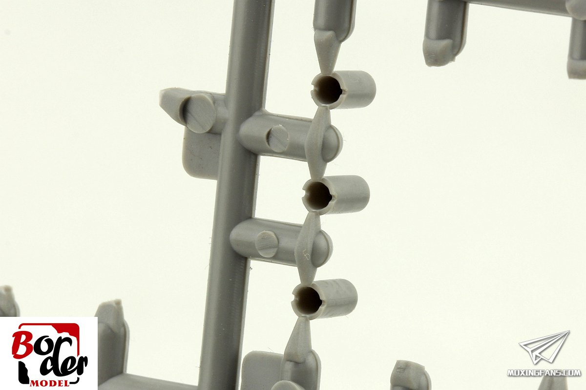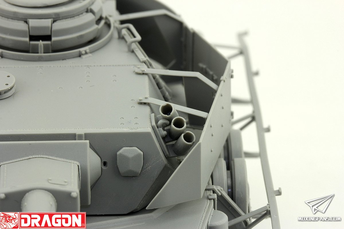 ▼ 说一下四号G的烟雾弹发射器,套件中只有威龙和边境的四号G提供了这个装置,H型已经不再安装了。对于烟雾弹发射筒这个零件来说,威龙给出的是射出件,边境则是车制金属件和射出件可选。从照片可以明确的看出来,边境的金属件虽然制作起来比较方便,但是管壁有些过厚了,不及威龙的射出件轻薄,射出件表现略好一些。