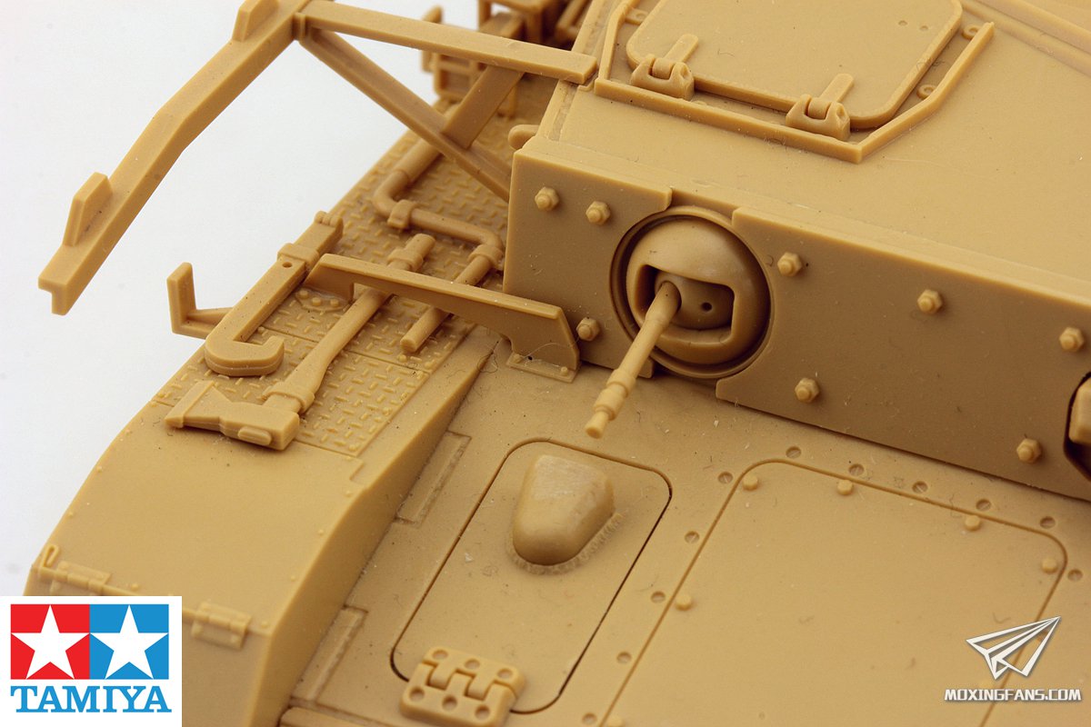 ▼ 边境的表现也是不错的。1,枪口同样开出,但是不如威龙的管壁那么薄;2,车灯给出了塑料灯线,但是有些偏粗了;3,前部和两侧开出了细腻的焊线细节;4,六角螺栓的表现比较锐利,但是漏出的螺栓偏短偏粗,直观看上去漏出的螺栓并不是那么锐利,影响了整体形象;5,工具扣没有开出镂空(需制作者自行镂空),但是提供了蚀刻片;6,检修舱门处的埋头一字螺栓细节锐利且朝向不同。车体侧面的装甲挂架厚度较薄。