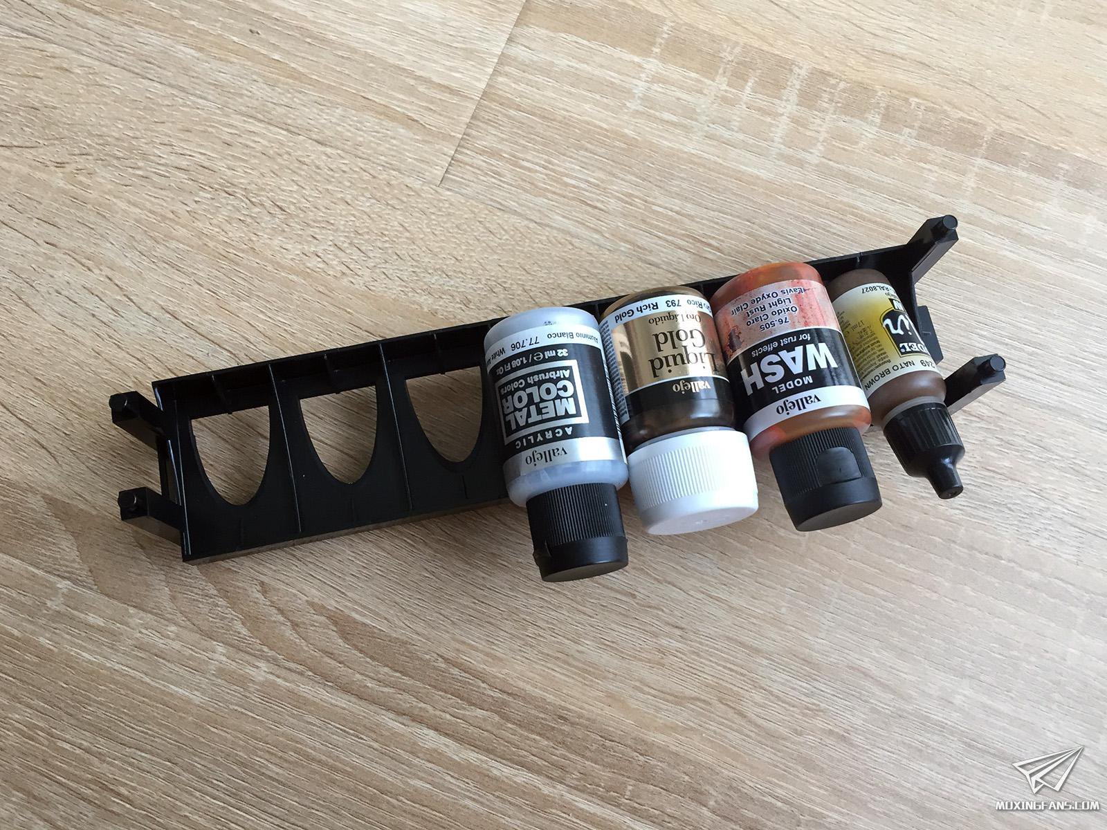 依据实际的使用, DSPIAE MPR-04/ 柯作GJ2014A/ 易模型收纳架都只能放置17mL的AV颜料瓶, 其他容量的AV颜料瓶并不适用。柯作与易模型均可用类似乐高拼接的方式, 往上下左右无限延伸。(有鉴于众多水性颜料品牌都参考AV颜料瓶尺寸, 因此若有购买收纳架需求时, 可以AV做为参考尺寸。)