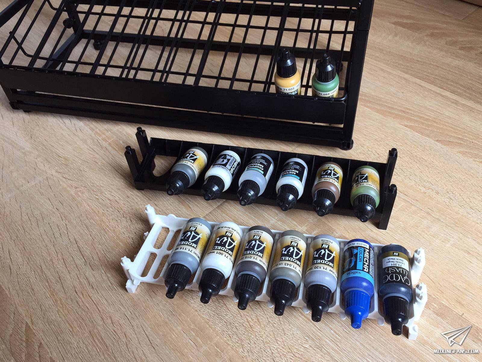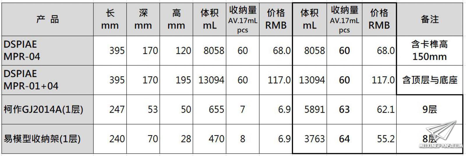 ========== 收纳架尺寸规格(mm): DSPIAE MPR-04:容量60瓶AV颜料 长x深x高(含卡榫)=395x170x120(150) DSPIAE MPR-01+04: 长x深x高= 395x 170x 195 柯作GJ2014A(一层7瓶): 长x深x高= 247x 53x 50 易模型收纳架(一层8瓶): 长x深x高= 240x 70x 28 ========== 以能购买的最小单元和收纳60瓶左右17mL的AV型颜料做了简表(注意DSPIAE是金属材质, 柯作和易模型是塑料材质)。