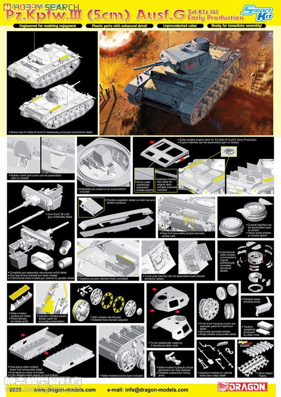 三号装甲车是中型坦克,它在巴巴罗萨行动作战中是德军装甲车中最重要的坦克。然而随着重型装甲车以及装有火炮的敌人坦克歼击车的到来,在1943年三号坦克的生产计划停止。其中一款模型在过渡时期生产的是G型,很多这款类型呈现了一个强而有力5cm KwK 38 L/42火炮,且装载在外面的炮塔中。此款有显著的改进,超过了最初3.7cm火炮。在坦克的正面、侧面、后面加固厚度30MM。从1940年到1941年2月,德军兵工厂总共生产了600辆三号G型坦克车,它们服役于东线战场以及北非战场等地区。 威龙无比自豪的第一个开发了这款1/35智力模型玩具-三号坦克。当然了此款模型阵容包括E\F\H\J以及现在即将到来的G型。这个模型的部件在威龙三号坦克的大家庭中属于最高质量。作为智力玩具,它吸取了威龙模型工程师的科技精华,加上它在尺寸精确性和简单组装上保持了完美的平衡。底盘上面使用注塑连成一体,下面精确比例。炮塔由3向滑动注塑而成。且提供了网丝的金属蚀刻片部件。此款塑料模型仍然呈现出一系列有趣的水贴纸标记。 G型早期型坦克正好填补了威龙1/35三号装甲车大家庭中的重大空缺!