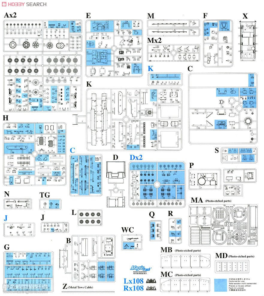 威龙这盒四号突击炮本来是很好的,猪头防盾造型很威武,造型也漂亮,金属侧裙,PE也不少,遥控机枪也很洋气。这款的多余配件也不少,杀肉也行。可惜的是威龙再版后就给阉割成了DS履带,性价比大跌,以至于现在某宝还有大量存货无人问津。唉,好好的一盒四秃子。。。本次评测以初版板件为基础,大家要和市面上的再版阉割货区分开来。 板件图和说明书: