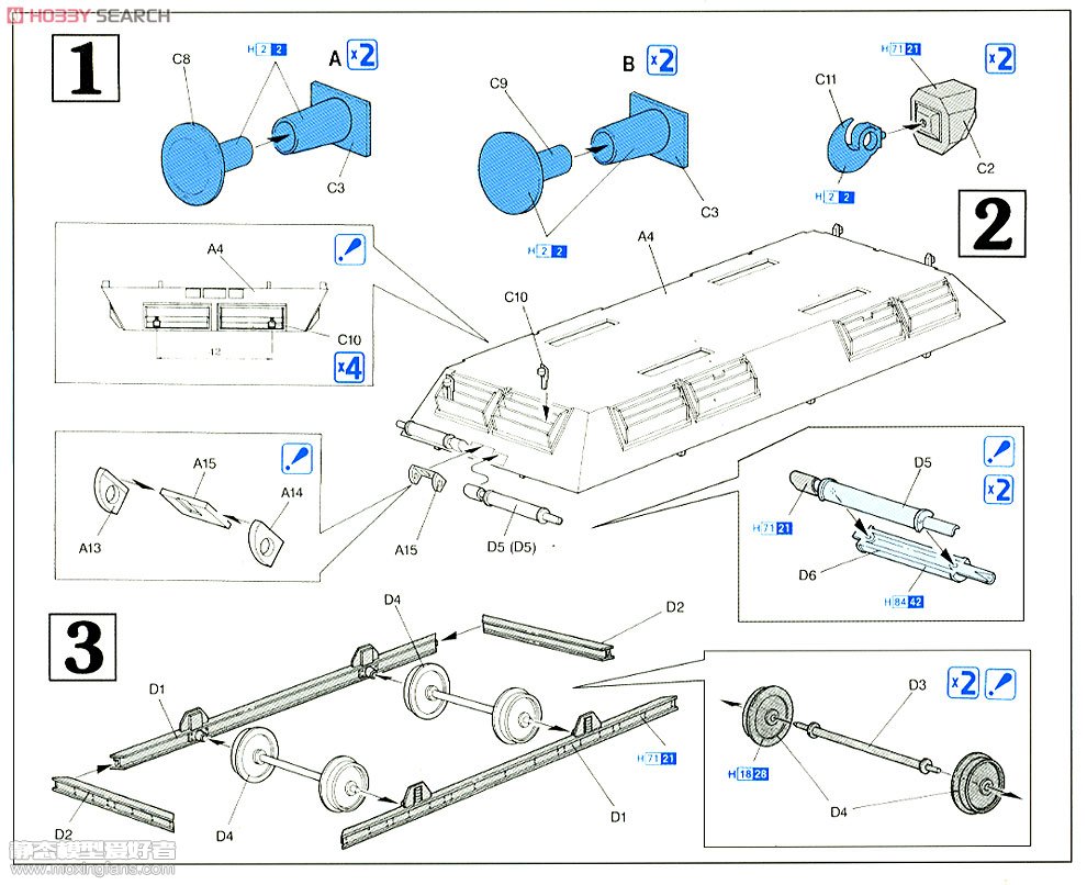 这套橙盒也是老货包装的,但是题材NB,铁路装甲车系列目前只有威龙出过,小号手也出过一些不同的系列。这个装甲车板件很简单,也没有什么组合度方面的问题,细节很粗犷,用来搭配威龙的其他铁路系列很不错,但是如果搭配小号手的铁路系列的话大家留意下,可能铁轨宽度方面有差别,无法接轨。号手的考证本来就不靠谱,威龙的也是老货,到底谁错,现在还不得而知。 板件图和说明书: