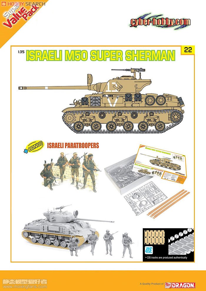 威龙的这盒橙盒也同样是老货重新包装,板件比较一般,细节不怎么样,组合度也不怎么样,这一点可以从后面老外的制作过程中看到,绝对补土杀手。但是纵观市面上,这个题材只有威龙一家独有的题材货,外形也很帅,以前橙盒卖96的时候还算有性价比,但是现在断货以后价格就十分不和谐了。这盒模型的兵人题材不错,以色列的兵人本来就不多,这盒兵也就是少有的几盒之一了,虽然细节不怎么样,但是题材还是很好。这盒的履带有3根,是因为沿用了M4的HVSS悬挂的履带,但是底盘却是加长的底盘,威龙不舍得再新开履带,只好拿原来的来凑数,不够长就只有剪多余的那条自己粘了 板件图和说明书: