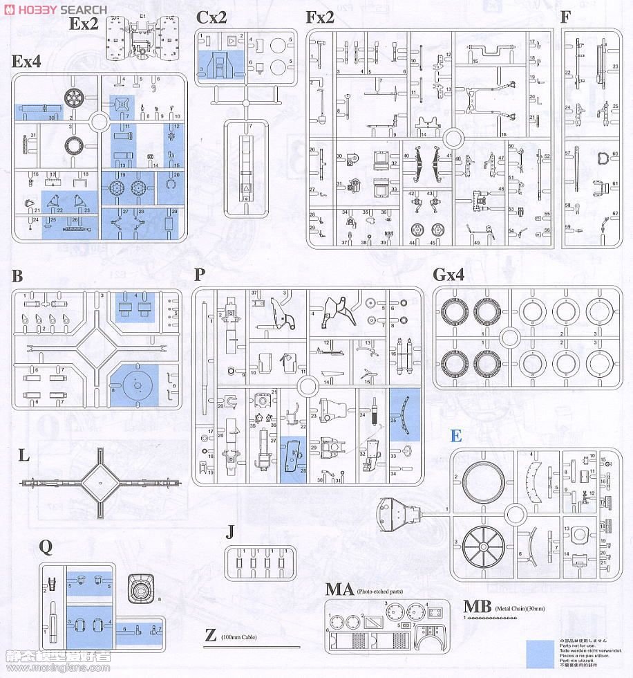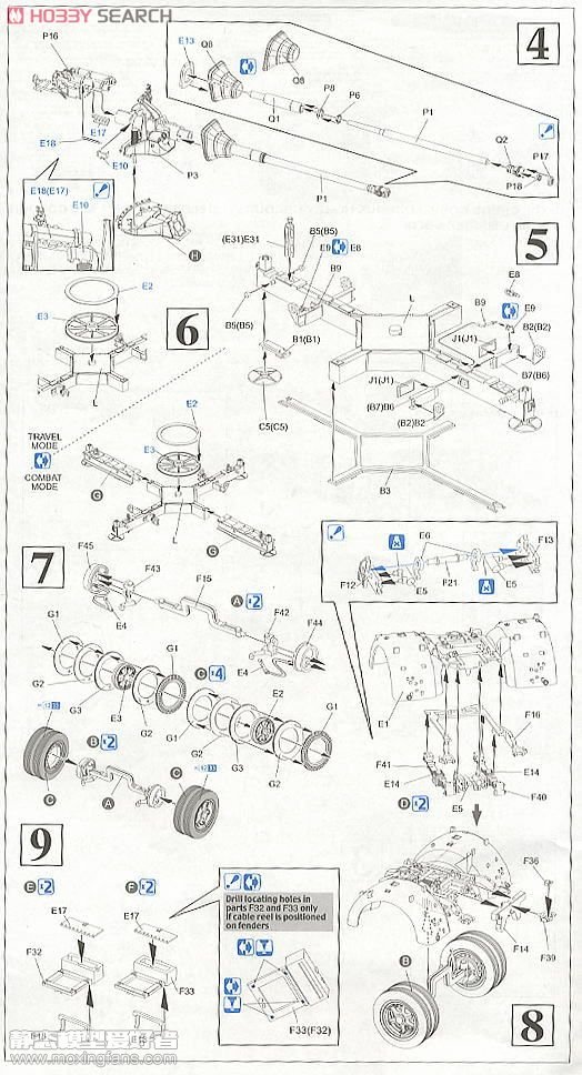 这是一门另类的88炮,是战争后期从战车上面拆下的火炮,更换了一个简易支架组装而成。威龙的这款模型为2009年开模,新开部件较多,包括火炮底座,火炮支架和一些小零件都是新开,老板件主要是火炮主体、防盾(猎豹炮盾),新开的零件都很精细,即使老板件也比较犀利,总的来说还是比较良心的。这门火炮的底座很是有点意思,和大多数的88炮都不同,显得比较迷你,好像是战场临时拼装的,非常有特点,如果制作战争后期的场景,会很合适。 板件图和说明书: