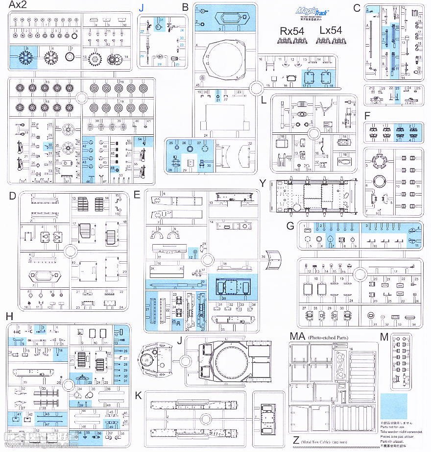 四号坦克F型是德国为了进攻苏联专门设计的,总结了以往型号的经验教训,重点放在加强装甲(正面50MM侧面30MM)、改善机动性(将原本的38CM履带加宽到40CM、加固行走系统)和简化工艺(车体正面装甲平直等细节),但是用的还是短管L/24的75炮。但是德国人发现这种先进坦克碰到T-34和KV后无法在火力上压制对手,所以着手加强火力,F型换装60倍口径50炮的方案被元首枪毙,在元首的强烈建议下装上了43倍口径75炮,带标志性的球状炮口制退器,定型为F2,原来的短管炮F型改称F1。 威龙的这盒四号F1为SK版,较以前的6264和6301在开模方面有较大的改进,零件数量不是那么变态了,区区690个零件较以前的1000+的零件有了大幅减少,而细节方面却丝毫不差,所以SK版的四号系列还是很值得收的,是威龙最成功的型号之一。这盒四号坦克使用了大量当时新开模的零件,板件锐利干净利落,焊线和铆钉丝毫不马虎,托带轮的细小铭文都表现出来,标配魔术履带,大张水贴给了足足10种涂装,蚀刻片也为6315新开的,诚意十足,目前市面上还有少量现货,但是其价格相对于以前有了不小的上涨,在魔术履带凤毛麟角的今天,这盒模型还有一定上涨空间,预祝大家理财成功! 板件图和说明书: