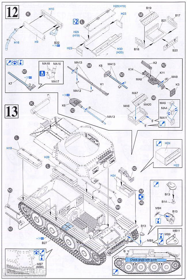 威龙的这盒38T是2007年推出的,德国人对38T底盘的运用算是淋漓尽致了,在上面搭载过各种反坦克炮,榴弹炮,这次更是将2mm的KwK38搬上了车体。就板件来说,继承了威龙38T的一贯作风,开模不错,细节丰富,组合度也没有什么大问题,满身的铆钉很是性感,只是考证方面有些不靠谱,PMMS说KwK38短了3mm,这点比较蛋疼,还得掏银子买金属炮管换掉。配置方面也继承了38T系列的风格,魔术履带,2大片PE,炮塔PE制防护盖,带有除发动机部分的内购。目前这盒模型在威龙的模型中还算是滞销货,市面上还有大量存货,如果没有真爱,可以等等再入。 板件图和说明书如下(细节图见后页):