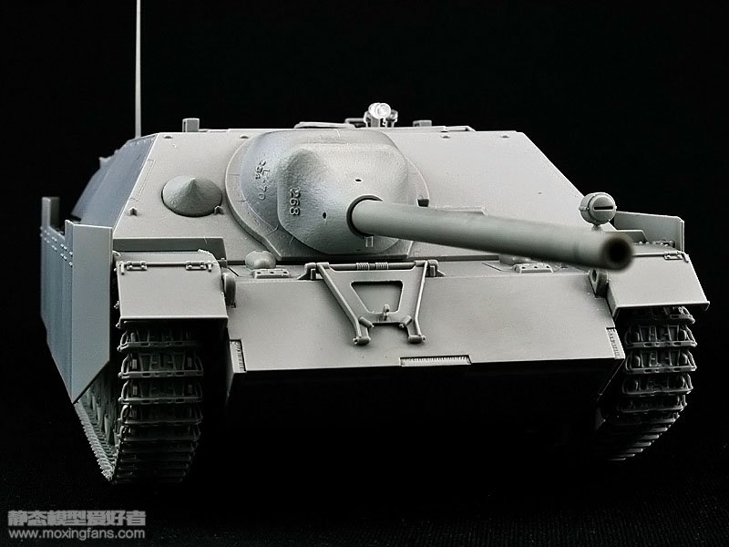 1944年9月以后生产的四号坦克歼击车的主要特征:1、前两组悬挂使用钢制路轮;2、托带轮减少为3个;3、战斗室上部侧面新安装了薄金属板质地的挡板;4、新型的纵式排气管;5、新型轻量化履带等等。附图为套件中提供的魔术履带为新开模的轻量化履带。