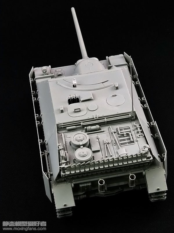 纵式的消声器为一体成型,而且表现出了细小的焊接纹。车体后部的备用履带支架两种可选,分别是H初期型和J后期型,J型的履带可以挂的更多一点,就可以使头重脚轻的战车的平衡性得到一点改善。