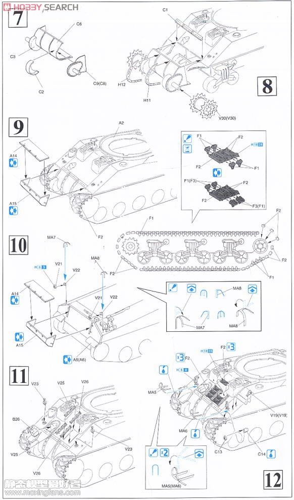 威龙的这盒橙盒萤火虫VC也是包装的老套件6121,这次将炮塔的M2机枪换掉了,蚀刻片一小片,履带依旧是拼接履带。别高兴的太早,威龙出的M4拼接履带质量并不好,细节较差,履带齿偏厚而且容易装歪,组合起来比较繁琐还不是可动的履带,除了比较持久以外被自家的DS履带完爆。这盒萤火虫细节一般,组合度没有大问题,据说考证的问题不少,如果想要出精品还需要下功夫改造一番。另外,这盒橙盒也是带有兵人的,这次的兵人来自MB,是三名英军向一位路人问路的题材,小编个人认为题材还是很赞的,人物的姿态也十分自然,稍加改造就能出彩,算是这盒的一个亮点。 板件图和说明书如下(部分来自HOBBY SEARCH):