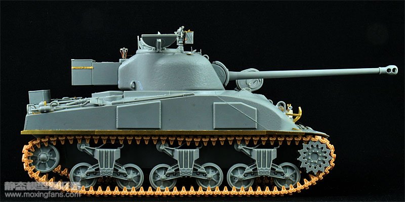 面对德军虎式坦克的威胁,英国人在美国提供的谢尔曼坦克的基础上加装了17磅炮,能够给德军的重型坦克造成有效的打击,这种坦克被称为“萤火虫”。最初的萤火虫是基于M4A4坦克的底盘的型号,被称为萤火虫VC,而随着战争的进行,后期补充上来的萤火虫的型号就变更为了萤火虫IC。萤火虫VC和IC的主要区别在于两者的车体,VC的车体为焊接结构,而IC的车体前半部分为铸造结构,后半部分为焊接结构,两者通过焊接结合在一起,这种车体通常被称为“混合型”。在某种程度上来说,萤火虫IC应该算是萤火虫VC的第二代后续车型,从1944年开始生产服役,一直到战争结束,用以补充一线部队消耗掉的萤火虫VC。 威龙的这套萤火虫IC炮塔为全新开模,车体则是使用了6441的零件,取消了车体前部的机枪,车体两侧的关键部位加装了附加装甲。炮塔后加装了大型工具箱,主要用以容纳无线电台和配重的作用。车体后部的空气滤清器有圆形和方形可选,车尾开出了具有英国特色的杂物箱。