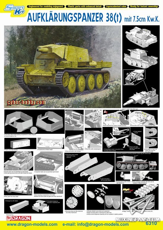 威龙在2007年推出了这盒奇葩的38(t),38(t)的底盘上面安装7.5cm火炮,也是一种带有实验性质的改装方案。据说德国人曾经尝试将四号坦克的炮塔安装在38底盘的坦克上面,但是并未成功,退而求其次将这门7.5cm Kw.K安装在了38(t)的底盘上面,并且重新设计了战斗室部分,为敞开式结构,最终产量只有2辆。没有将这盒套件包装成白盒实在是威龙的失误,可能是因为这辆车实在有些丑。。。套件新开了火炮部分和战斗室部分,其中战斗室装甲为一体式开模,细节不错,组合也很方便。配置方面配有2片蚀刻片和魔术履带,隶属于SK系列,算是很良心了。 板件图和说明书如下(来自HOBBY SEARCH):