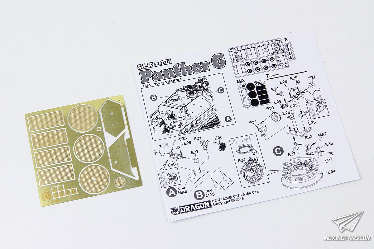 今年2月份威龙的这个夜战型豹式坦克—豹式坦克G型系列再版单想必大家都还记得把,在模友们苦等了三四个月之后,这几款豹G先后在某宝到货了。有的模友在拿到套件之后就向小编爆料说威龙对板件进行了调整,极大的勾起了小编的好奇心。小编的这盒6384防磁豹G到货较晚,现在跟大家分享下威龙今年豹G再版的调整情况。 ▼ 板件方面除了加入了魔术履带以外还对板件和蚀刻片进行了细微的调整。主要更改的射出件零件位于E板,主要为行走部分的路轮和悬挂等零件,共4板,也就是有4套夜视仪。蚀刻片方面也增加了驾驶室和炮盾的夜视仪支架,并且附带了1小张说明书。如果不出意外的话,这次再版的豹G应该都是对这几板零件进行了修改,配置也是一样的。