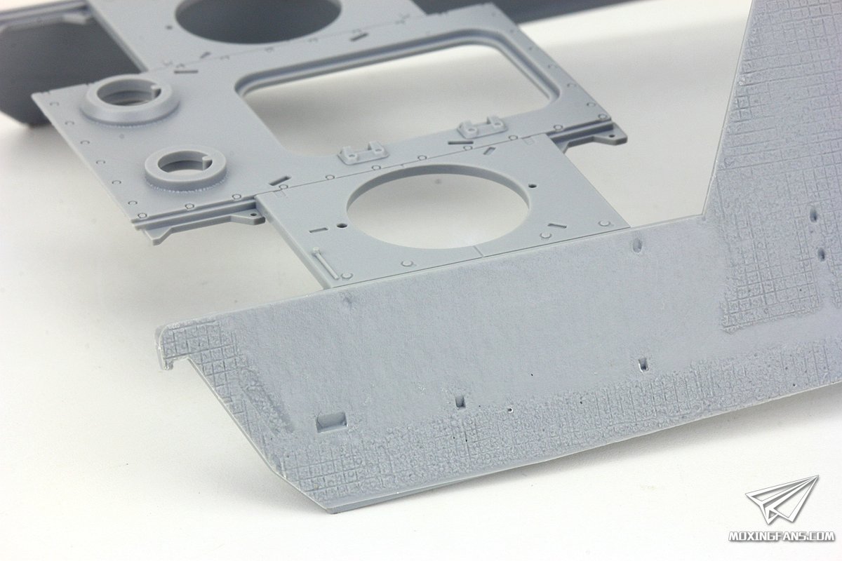 ▼ 因为6458大家都比较熟悉了,小编前不久也刚刚做过评测,所以这部分零件就不赘述了,详情模友们可以参考:【威龙 6458】1/35 德国猎豹坦克歼击车G1初期型开盒评测 我们这次主要来说一下防磁的部分,这部分零件主要是6474的。猎豹的防磁装甲不同于黑豹,比较常见的是一种小方格的防磁装甲,而且表面较为粗糙。威龙的防磁猎豹下车体直接开出了这种防磁装甲。