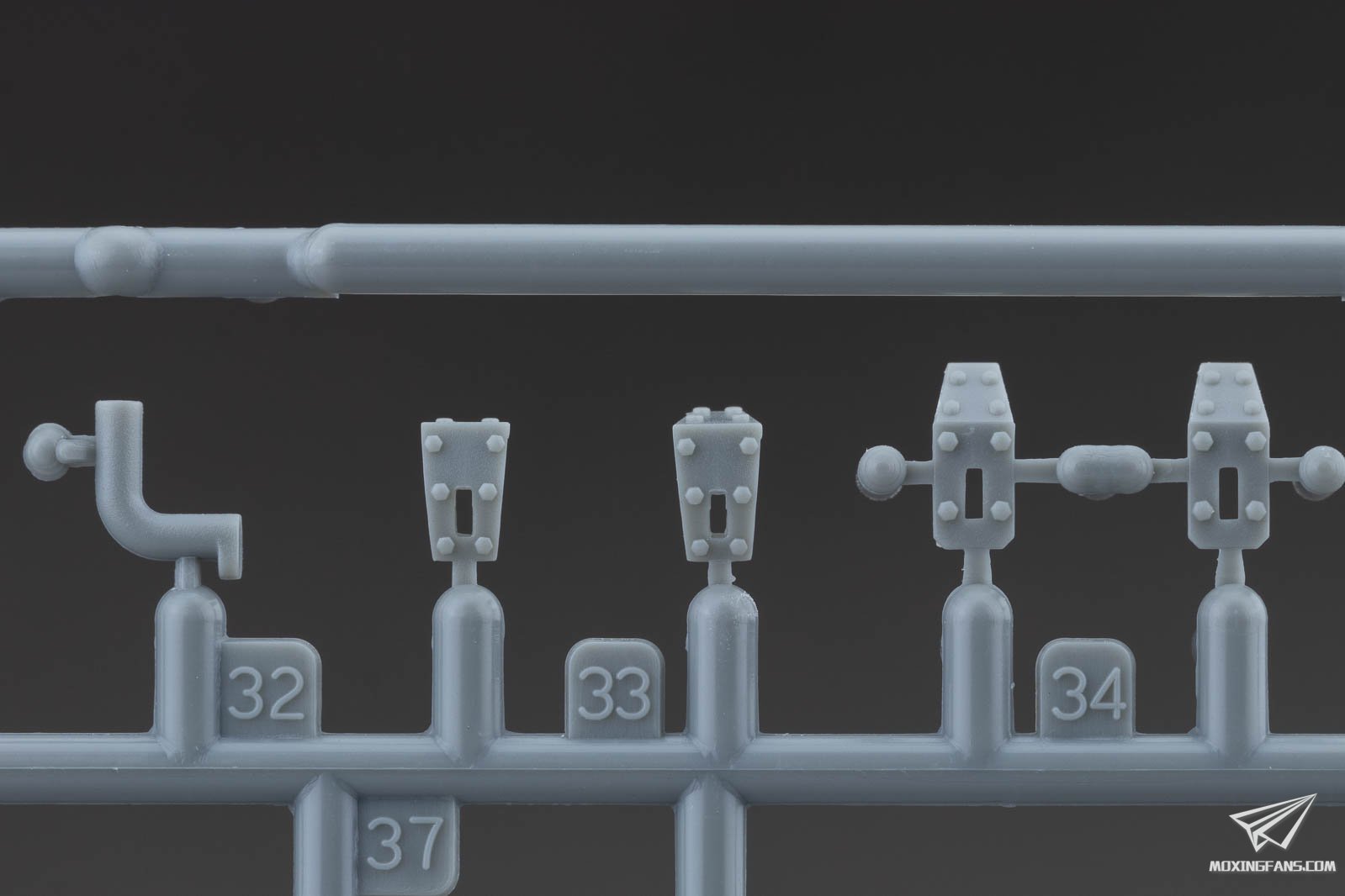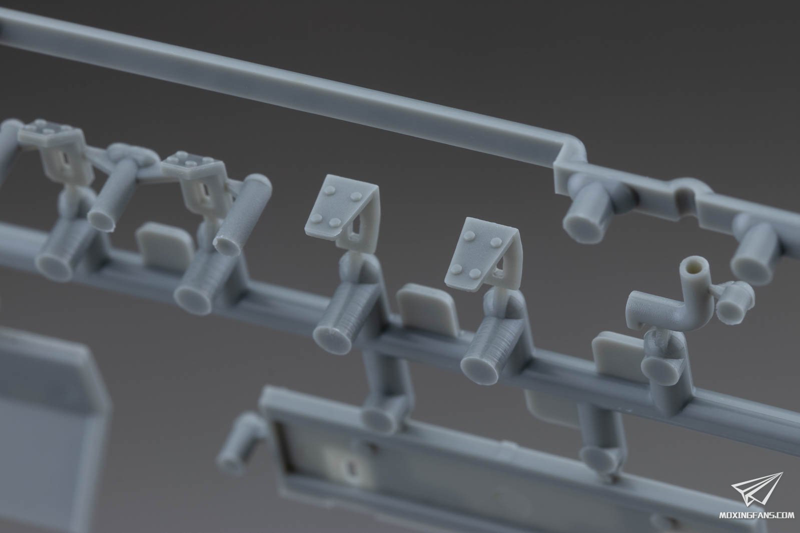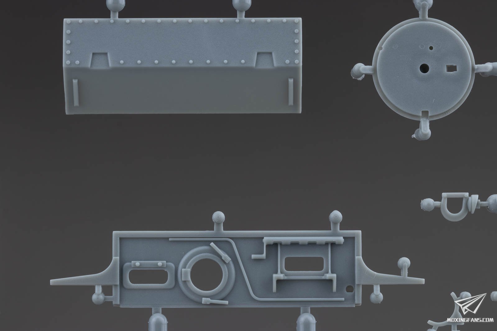 ▼ 车体主要零件的细节。螺栓和铆钉的锐利度不错,六角螺栓的朝向均相同,一字埋头螺栓的朝向不同。钢缆头滑块开出了孔,机枪也开出了枪口细节。