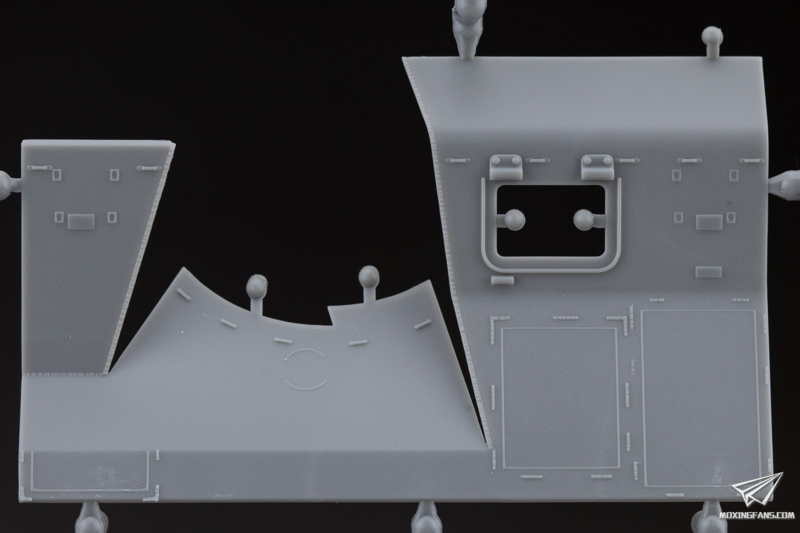 ▼ 车体主要部件的细节。前部减速器护罩开出了铸造感和铸造编号,尾部舱门的一字埋头螺栓细节锐利且朝向不同,战斗室地板开出了防滑纹,战斗室的主要装甲边缘开出了焊线细节。