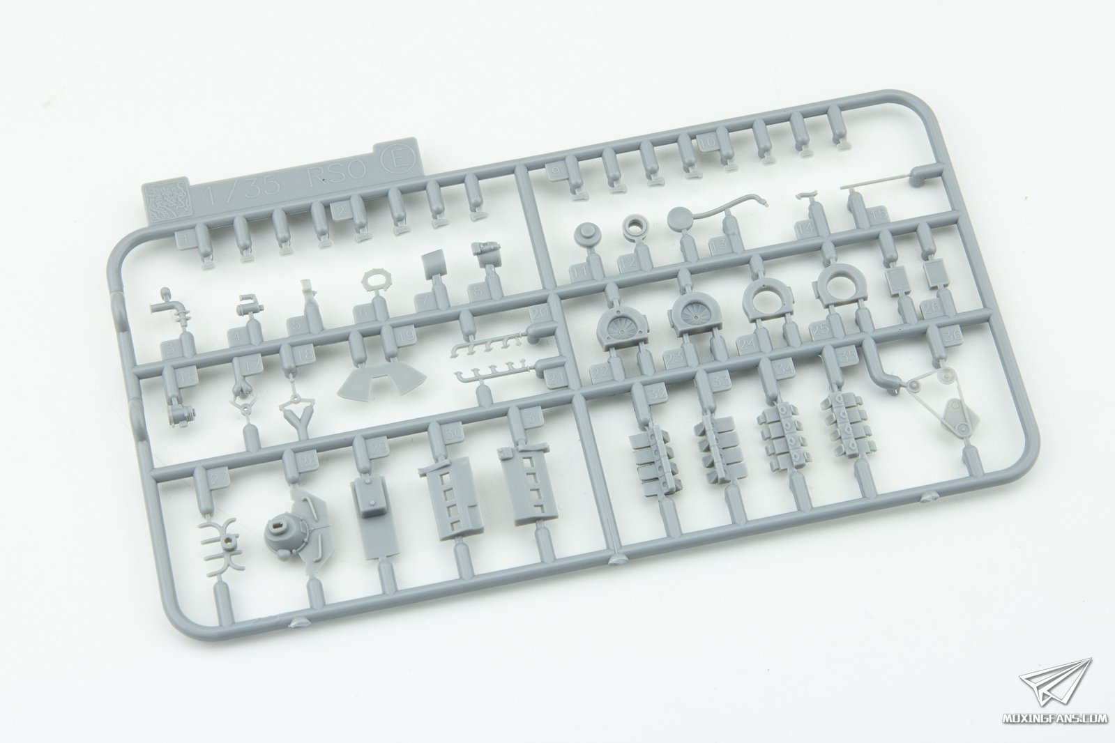 RSO是由奥地利的史泰尔公司设计制造的,用以应对恶劣路况的一种廉价类似于拖拉机的履带式牵引车。初期使用冲压成型的圆形车头,到了中后期大批量生产时则使用更容易生产的三角形车头。二战中德军大量生产这种牵引车,前前后后加起来共生产了超过23000辆。RSO的额定牵引重量是1.5吨,但是也存在其牵引10.5 cmleFH 18榴弹炮(重量2吨)的历史照片,所以牵引力还是很出众的。 ▼ 威龙自2010年开始推出RSO底盘的套件,而这款圆头RSO是其中最有特色的一款。不同于后期型三角头柴油发动机的RSO,这款初期型圆头汽油发动机的型号外形更加圆滑,给人一种呆萌呆萌的印象。这次威龙再版跟上次相比,在配置方面毫无更改,2张蚀刻片,魔术履带,车窗遮盖纸等配件齐全,甚至还多给了一套加宽的雪地/沼泽拼接履带。
