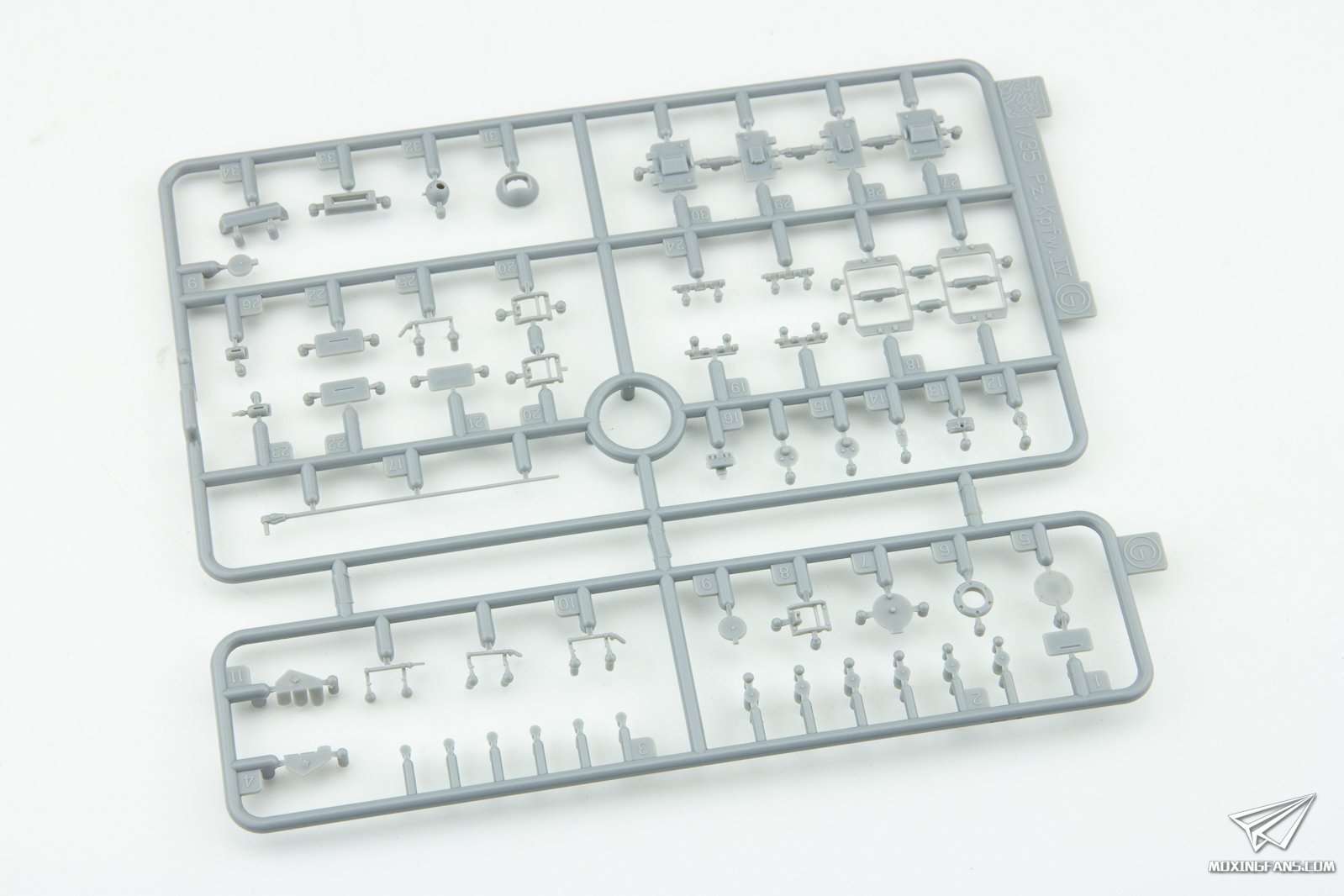 非洲军的装备总是有一种特别的味道,也是很多模友非常喜欢的题材。在众多非洲军的题材中,这款三号H指挥型显得非常特别,这款坦克是基于安装有5cm KwK L/42火炮的三号H型,并且在其上安装了远距离大功率天线和相对应的无线电台。因为无线电台占用了大量的车内空间,所以火炮被移除,只是安装了一根假炮管用于恐吓对手,用于自卫的只有一挺MG34机枪。 ▼ 威龙的这款6901是在2017年推出的SK版三号,是在之前推出的6844的基础上新开了储物箱等部件,并且对前作在细节方面进行修正以后推出的改进版。相对于一般的三号坦克,这款三号的板件数量很多,蓝色零件非常多,带有一部分战斗室和炮塔的内构,配有魔术履带和蚀刻片。