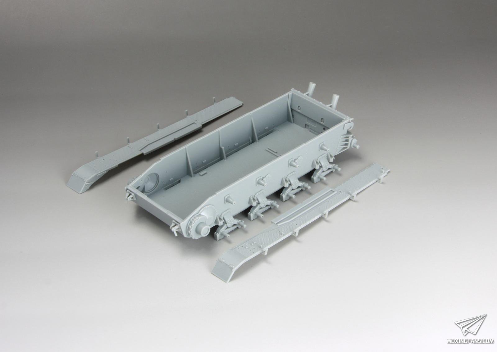 两侧翼子板必须得先粘接到底盘才能进行车体上部的粘接。 上车体粘接完毕后在进行车体工具小零件的粘接,上车体和底盘的粘接基本没有需要补缝的地方,组合度优秀。