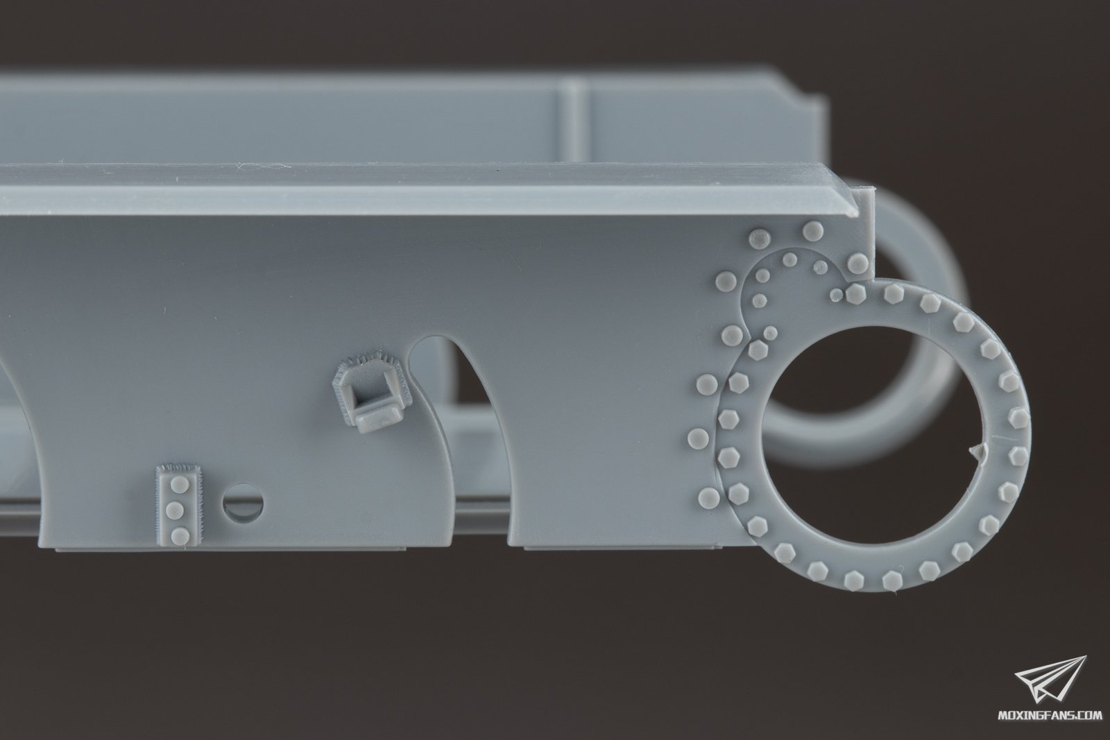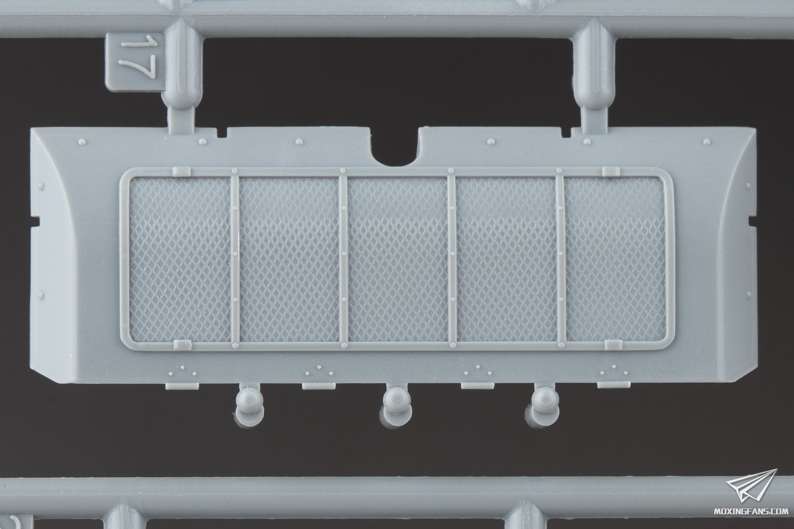 ▼ 车体主要零件的细节。上车体跟1942年型交错咬合的装甲不同,这款的钢板之间是直线焊接的,焊线表现跟之前的产品处于一致水准。其他零件,比如2种可选的防爆网得以保留。