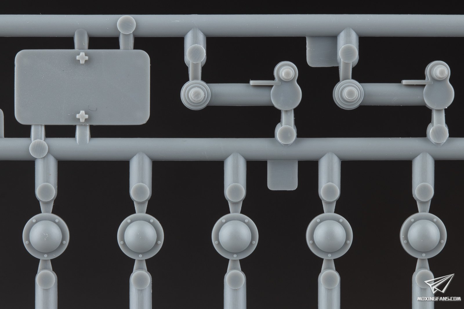 ▼ 行走部分,这盒套件提供了完整的2套轮组可选,细节方面处于同一水准,螺栓表现的较为锐利。履带方面依旧是那套大家熟悉的公母魔术履带。