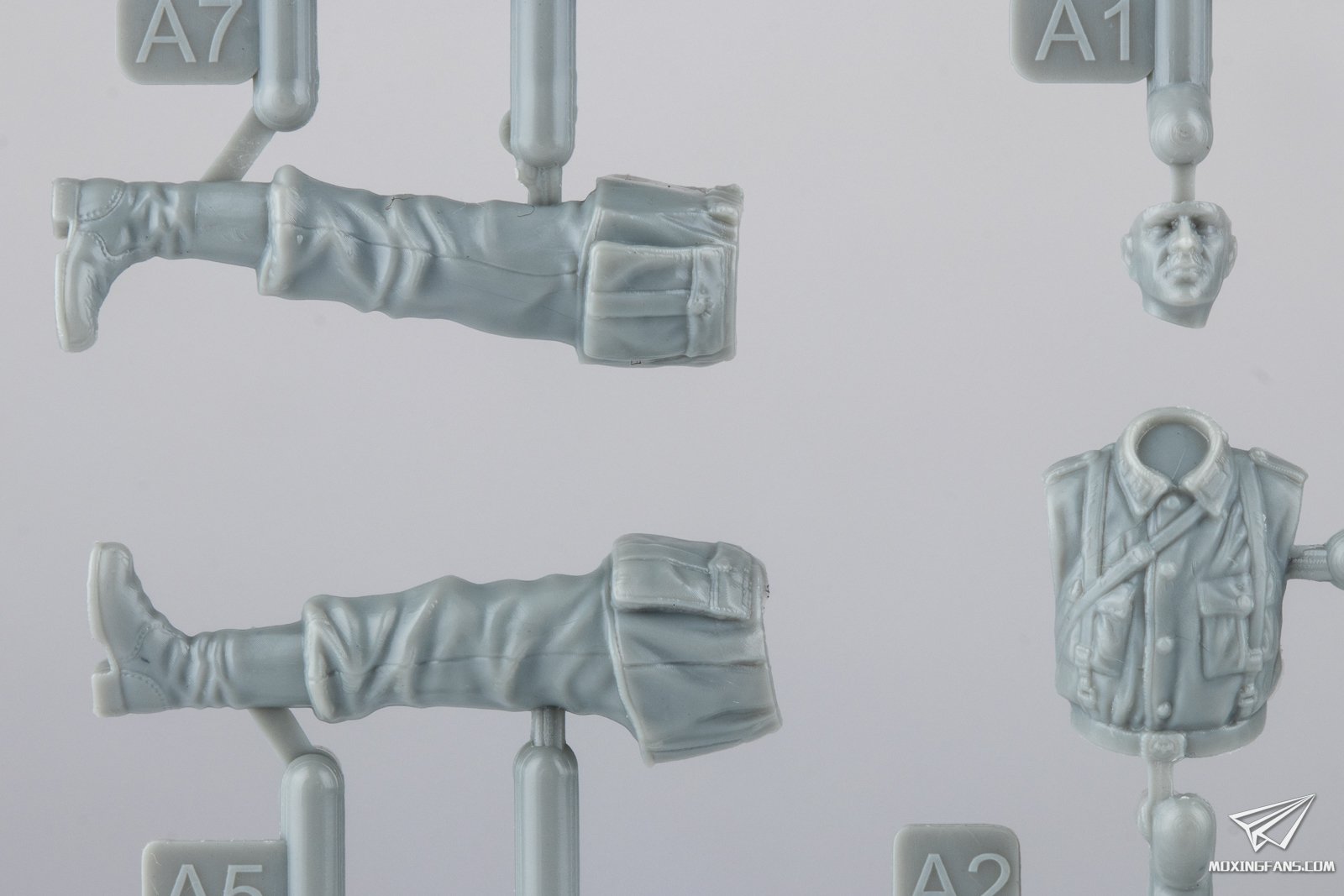 ▼ 3个人的细节。这盒套件属于1代半兵的范畴,这个时期威龙人形细节表现还不错,分件也不繁琐,但是动作较为生硬和死板,有点类似摆拍。