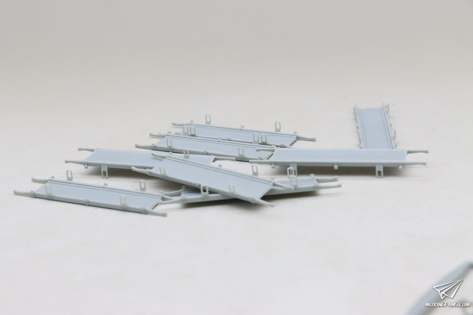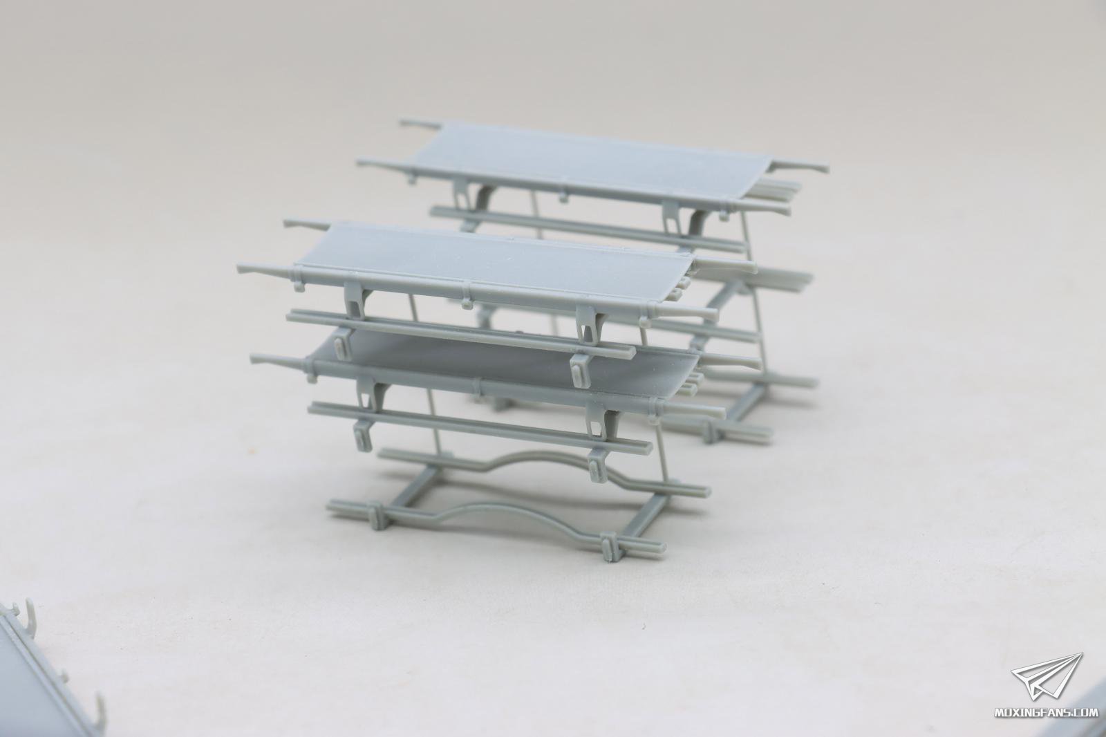 然后是医疗车舱的拼装,先是从里向外,将各种配件做起来。 封闭式车厢的门窗区域可以根据制作构思选择性地制作成敞开或者关闭的状态,而车厢后方的踏步台阶同样能够组装成挂载收起和落地展开两种不同的形态。箱体内部带有非常丰富的内构细节,包括组合式贮藏柜、工具箱、座椅、医用担架组和堆放支架。这些细节配件均为新开模生产,担架不仅可以层叠列组也可以单个独立使用,是制作题材场景的理想道具