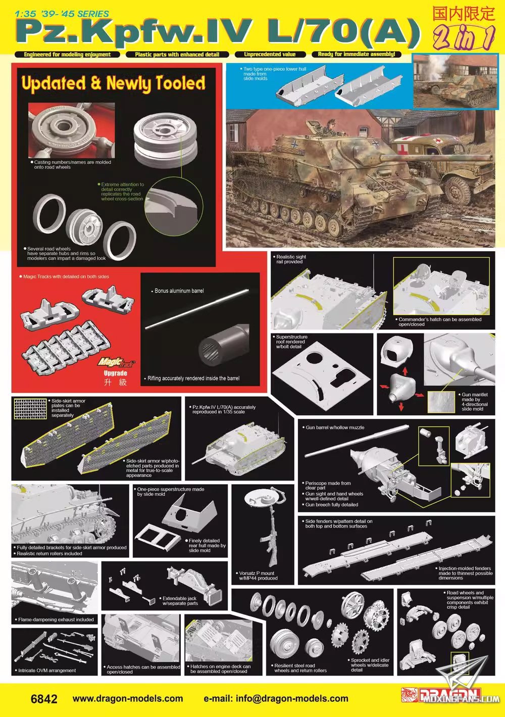 威龙在今年年初再版了两款四歼L/70(A),货号分别是6784和6689,分别是最常见的L/70(A)和最后期型的L/70(A)。时隔半年,威龙的二合一版四歼L/70(A)终于上市,下面我们一起来看一下这款四歼表现如何。 ▼ 这盒套件为2in1套件,可以选择制作成普通四歼L/70(A)和最后期型的L/70(A),附带2套下车体,增加了新版负重轮,附带魔术履带,蚀刻片,铝合金炮管和金属网材质的侧裙板。