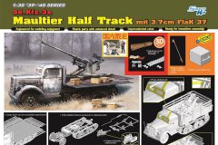 骡子半履带是以大名鼎鼎的欧宝卡车底盘为基础,将后轮变更为履带驱动的形式就是变形车,主要用于应对恶劣的路况,不仅用于运输货物还经常被用于拖曳轻型火炮,可谓多面手,被德军士兵们情切的称为“骡子”。在承载力更好的骡子半履带上搭载各种火炮也是常见情况,比如这俩搭载了FlaK 37高射炮的高射炮骡子就是其中一款。 ▼ 这个题材早在2012年威龙就曾经推出过白盒套件,货号是6768,时隔12年,这盒套件以普通SK版的形式重新再版,下面我们就来看下表现如何。这次再版附带2张蚀刻片,魔术履带,3D打印零件和车窗遮盖纸,此外还附带了一组人形。