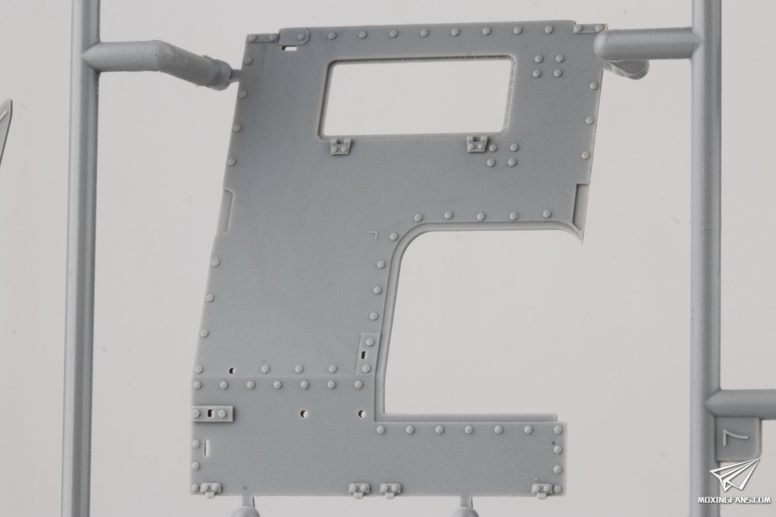 ▼ 战斗室主要零件的细节。各种铆钉细节依旧丰富,边缘干净利落,而且推出孔控制的也比较到位,战斗室内侧装甲板并没有明显推出孔。