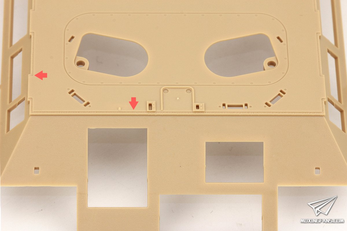 ▼ 下车体采用了多面开模的方式,装甲之间的拼合方式为咬合,请留意箭头处的焊线细节。