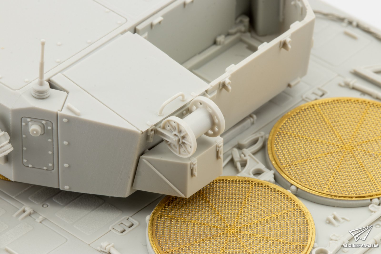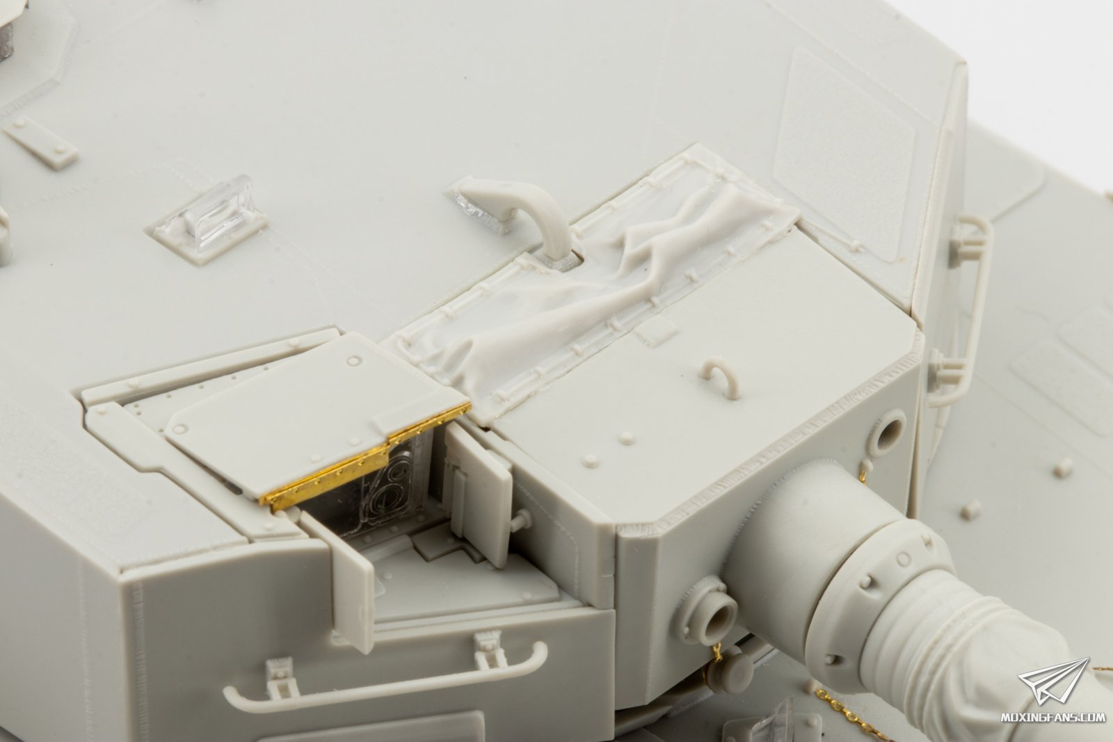 火炮是传统的两片式开模,根部的防雨布也开出了褶皱感,炮塔侧面的焊线开的比较锐利。