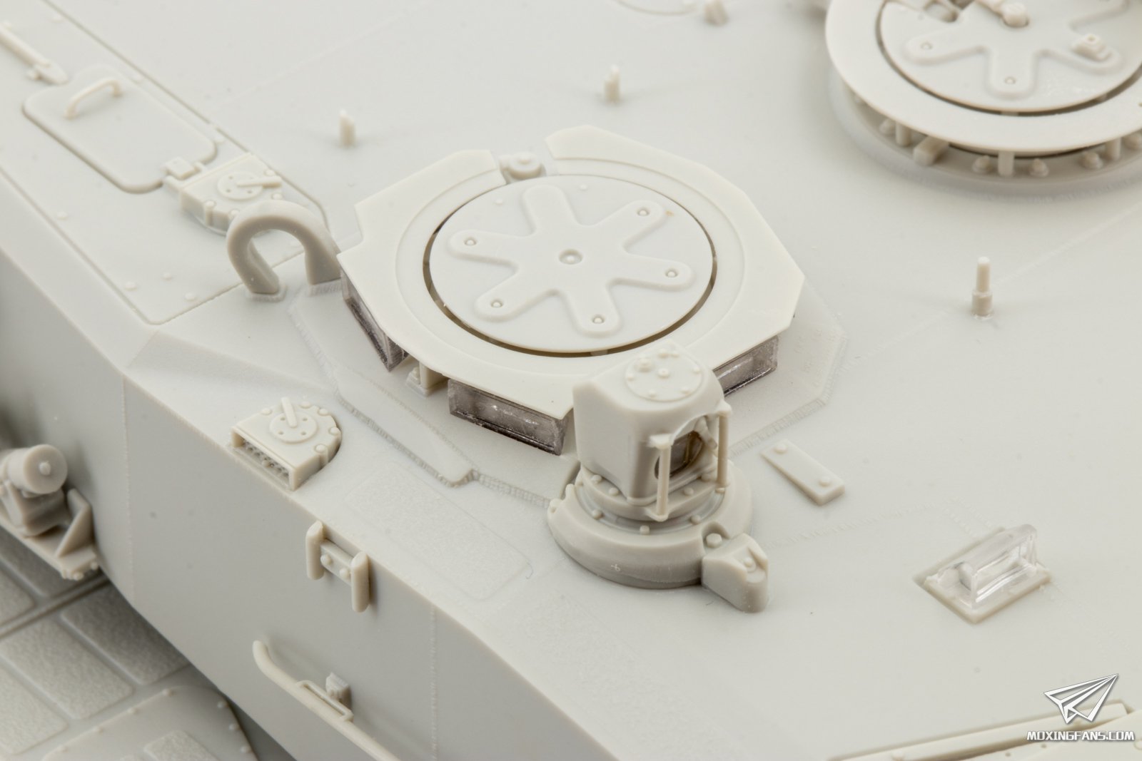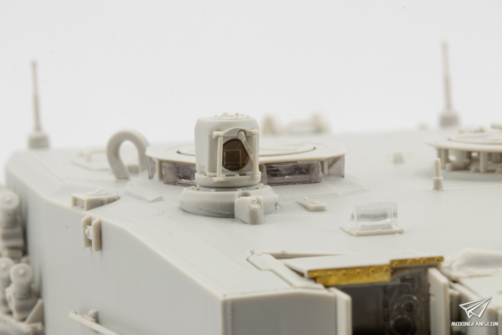 炮塔的观瞄系统的细节,这部分也是采用了透明件来表现,细节非常不错,周视仪还开出了个很可爱的小雨刷。