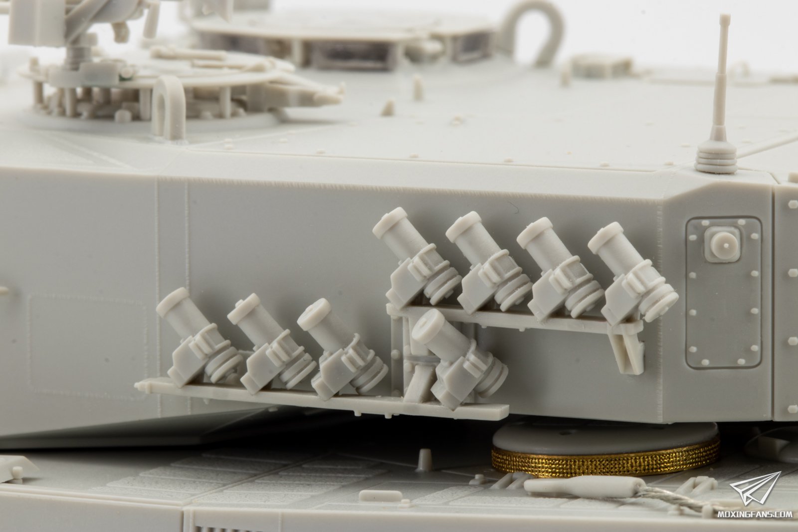 炮塔侧面的烟雾弹发射器,下面那一排其实是有一定角度的,从前往后角度以此增大,在安装的时候要注意一下。