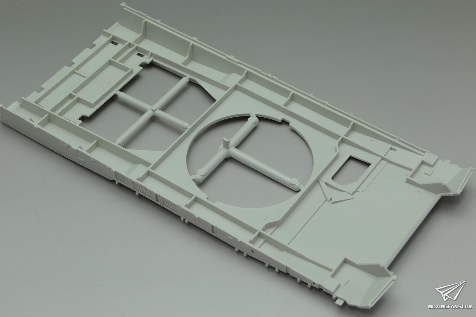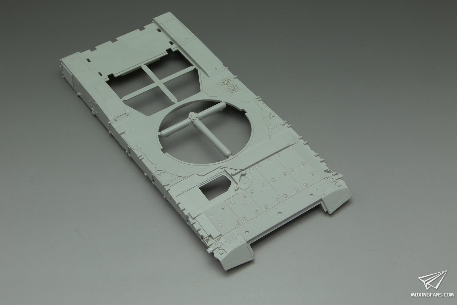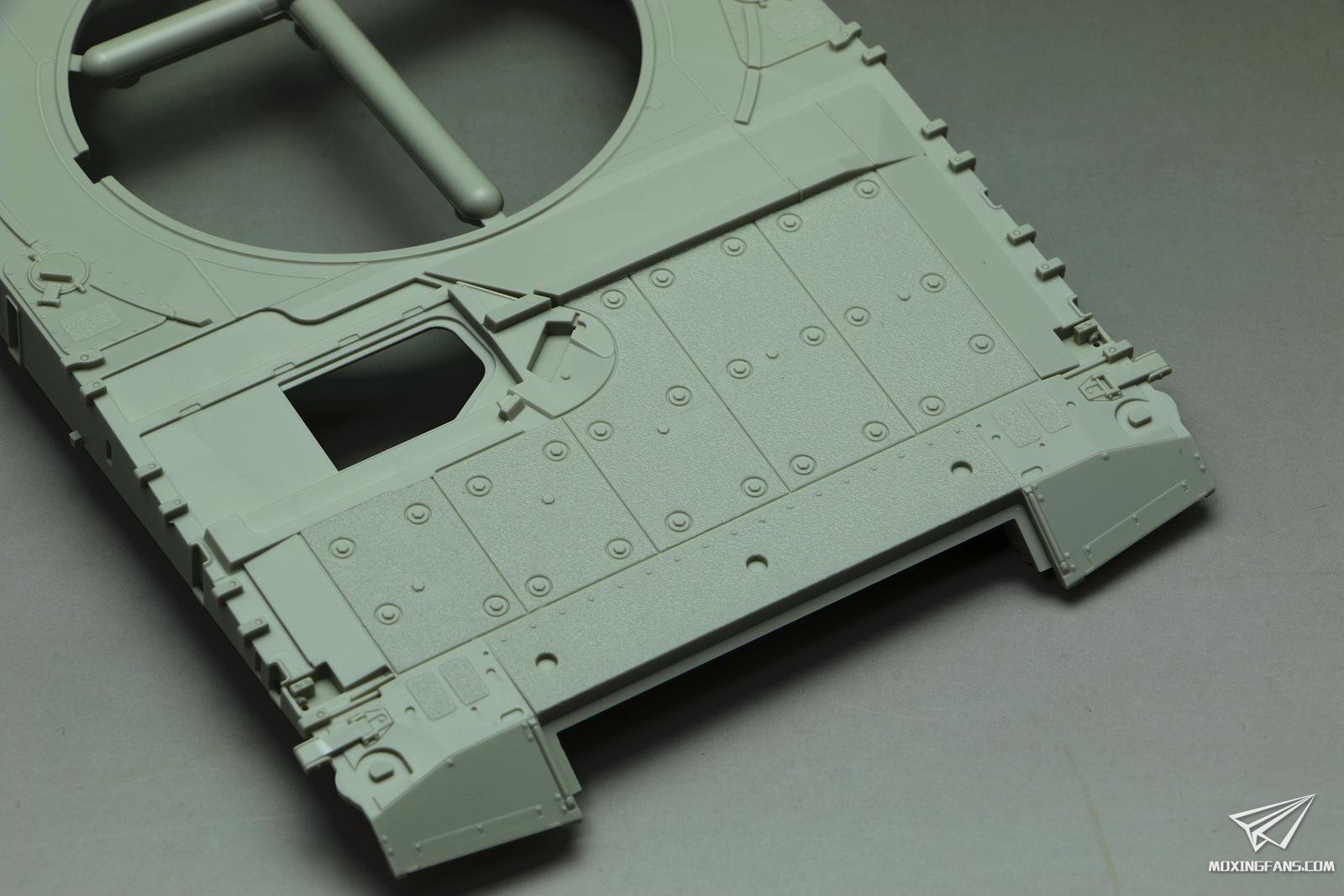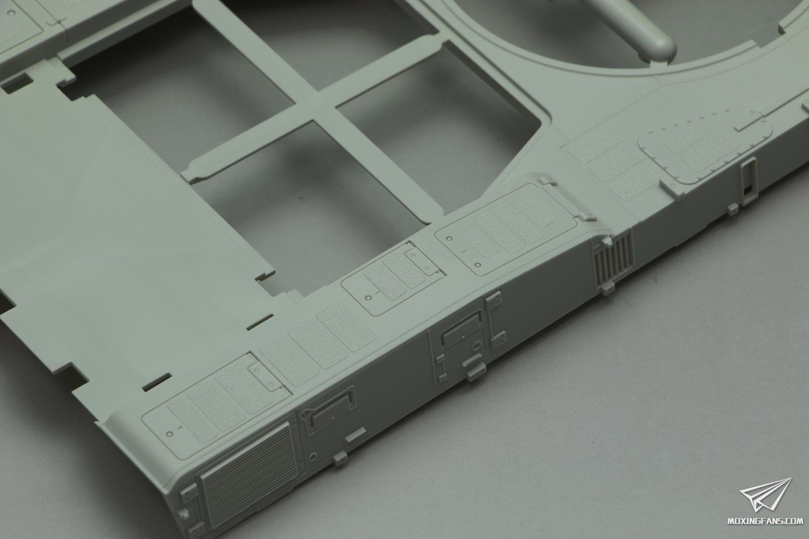 车体底盘也是重新开模的,主动轮变速箱这里开出了一整圈螺丝孔的细节,虽然粘接了看不到,但是有和没有是态度问题,值得点赞。