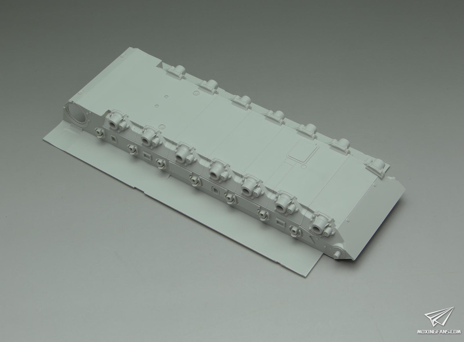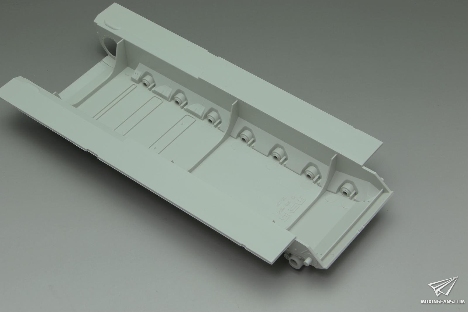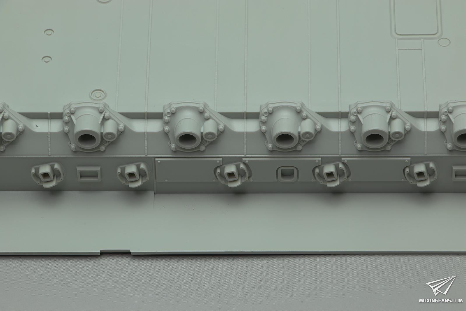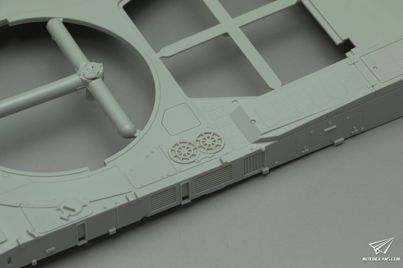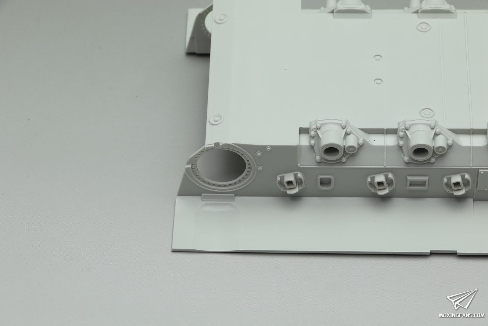 车体底盘也是重新开模的,主动轮变速箱这里开出了一整圈螺丝孔的细节,虽然粘接了看不到,但是有和没有是态度问题,值得点赞。