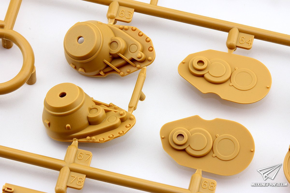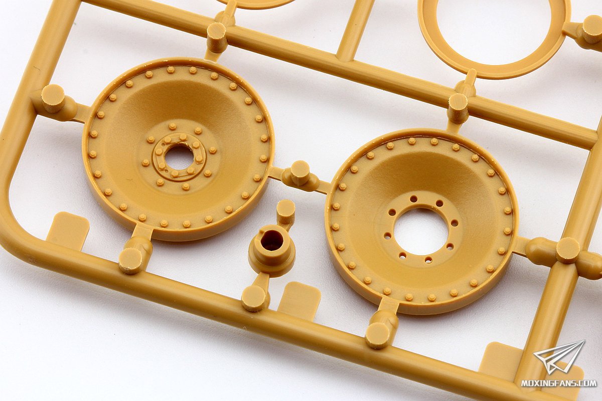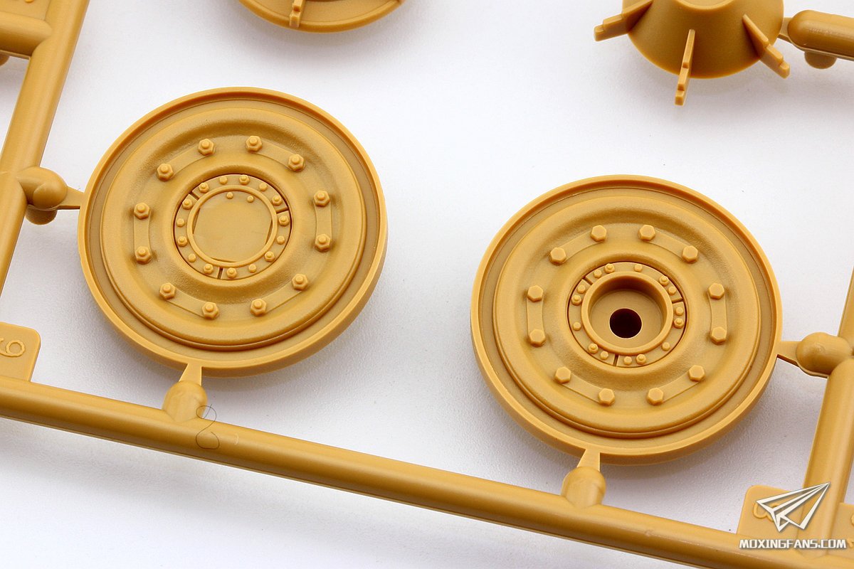 ▼ 麦田的这盒全内构豹G其余部分想必大家已经比较熟悉了。小编简单说说,行走部分是活动悬挂加活动履带的配置,轮子部分开模非常锐利,螺栓细节和胶圈上的文字细节都可圈可点,套件还提供了烧掉胶圈的战损负重轮可选,最后一对负重轮也可以选择钢制轮。履带为大家比较熟悉的销钉活动履带,正面有一个推出孔,履带板上那微小的铸造编号细节很精彩。