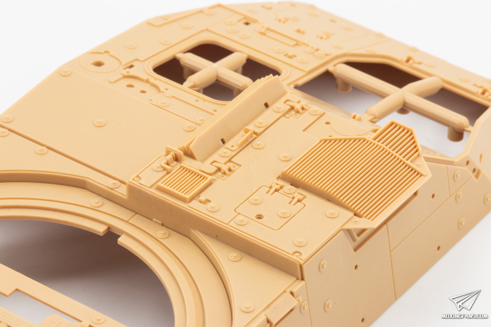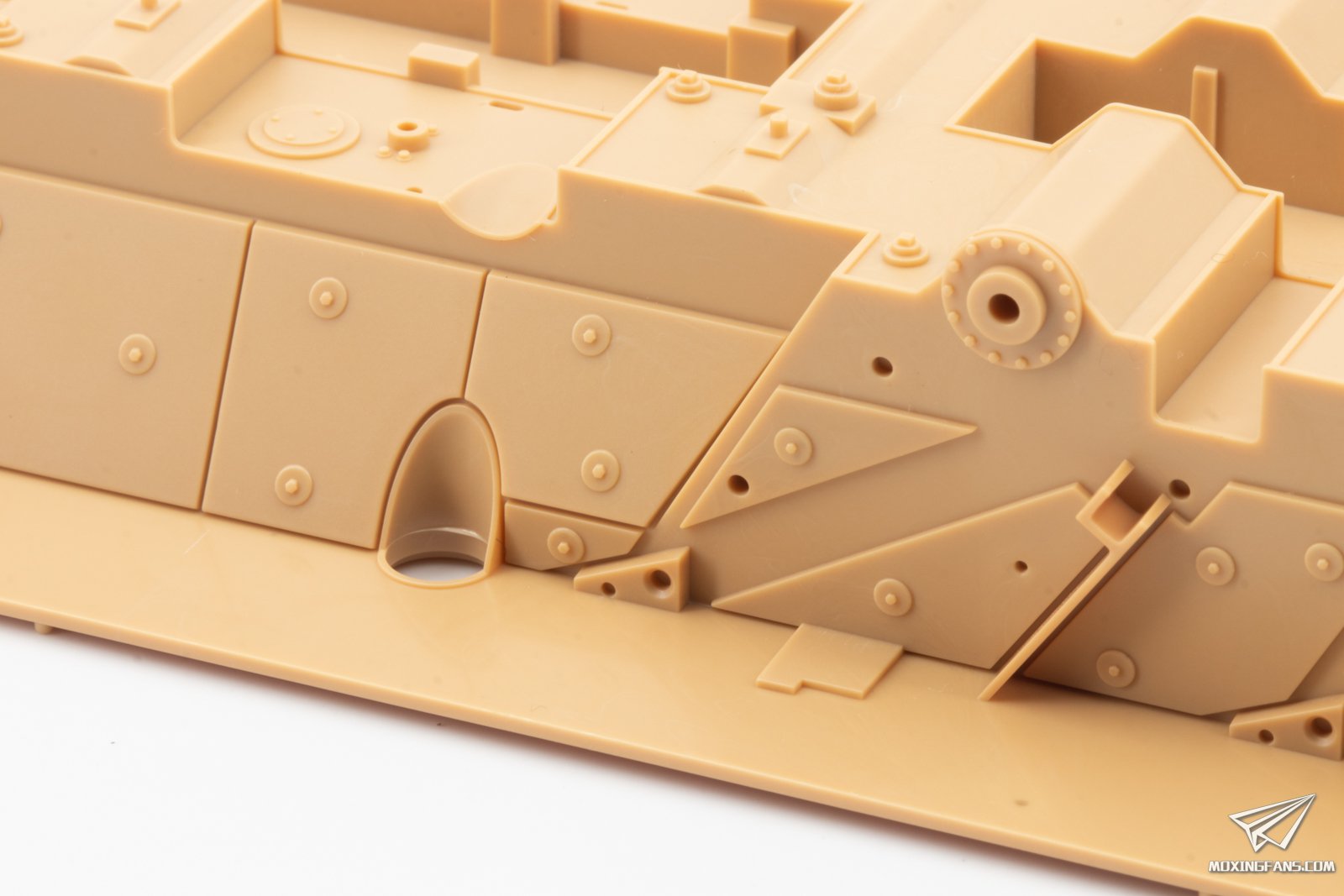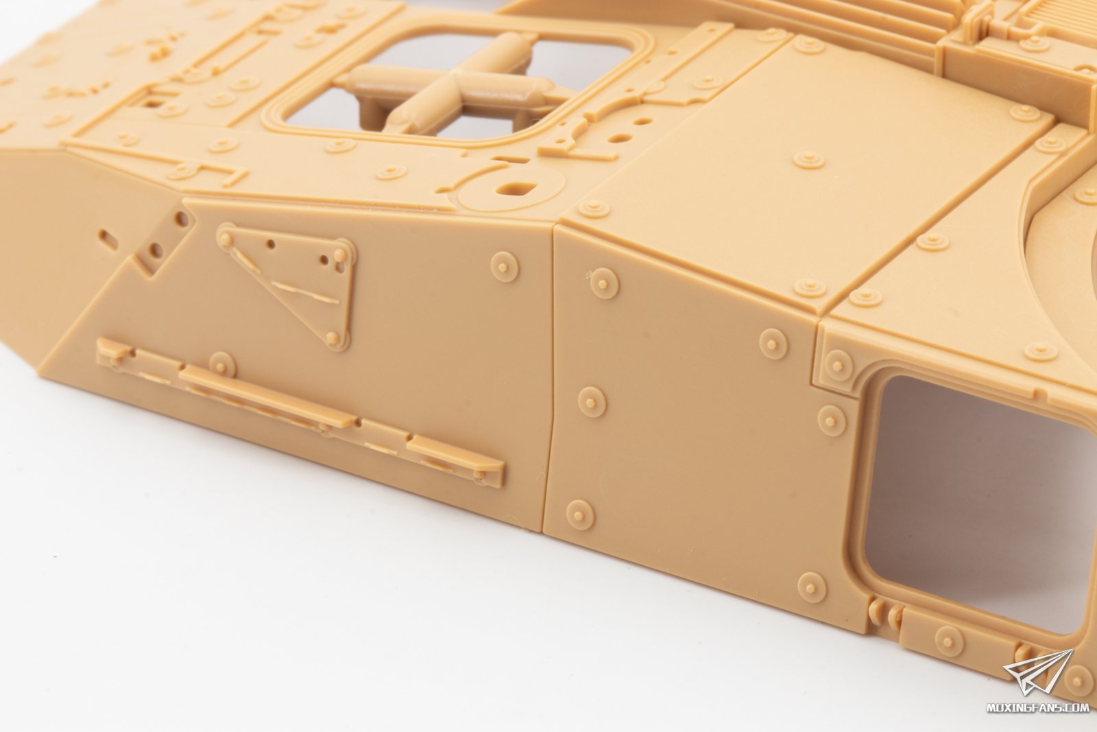 ▼ 下车体和上车体的细节,斯崔克标志性的大型螺栓开模比较工整,斜面上的螺栓头有轻微变形,但是并不严重,完全可以结束,装甲表面开出了细腻的防滑纹细节。