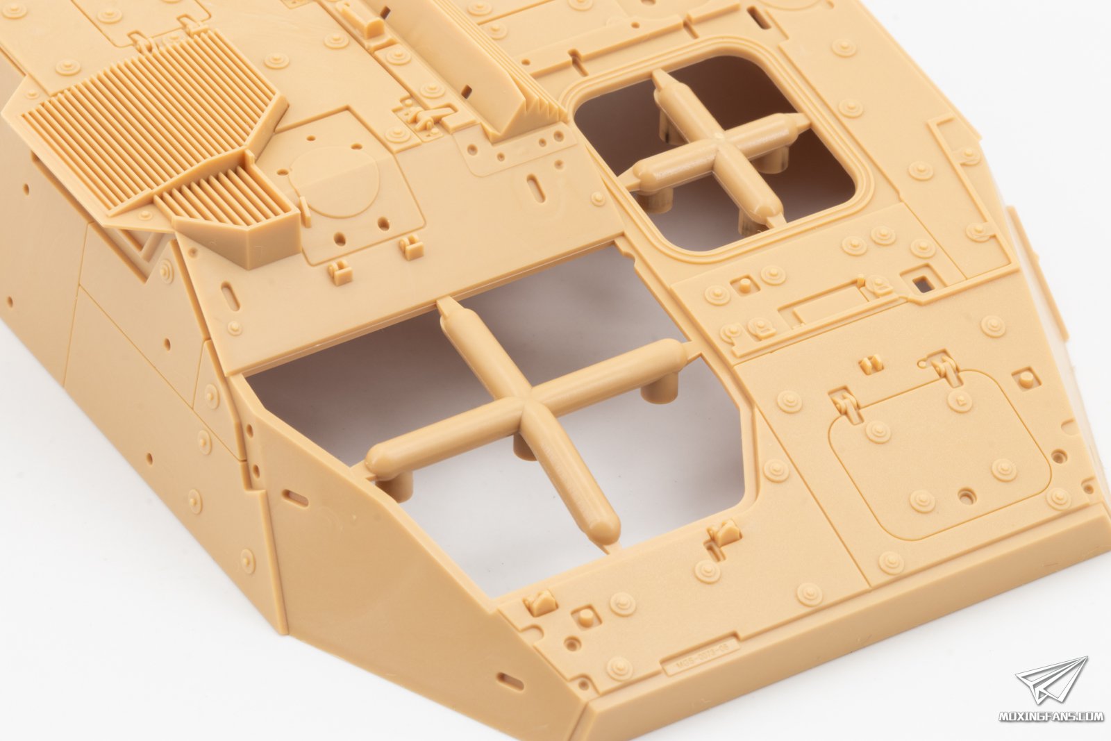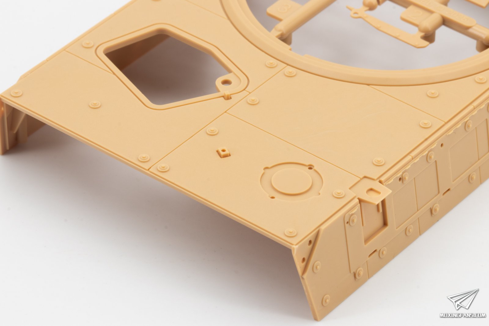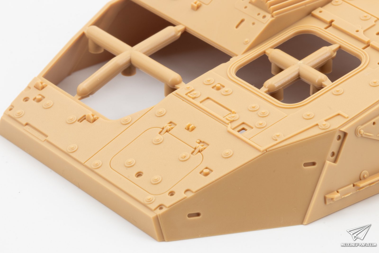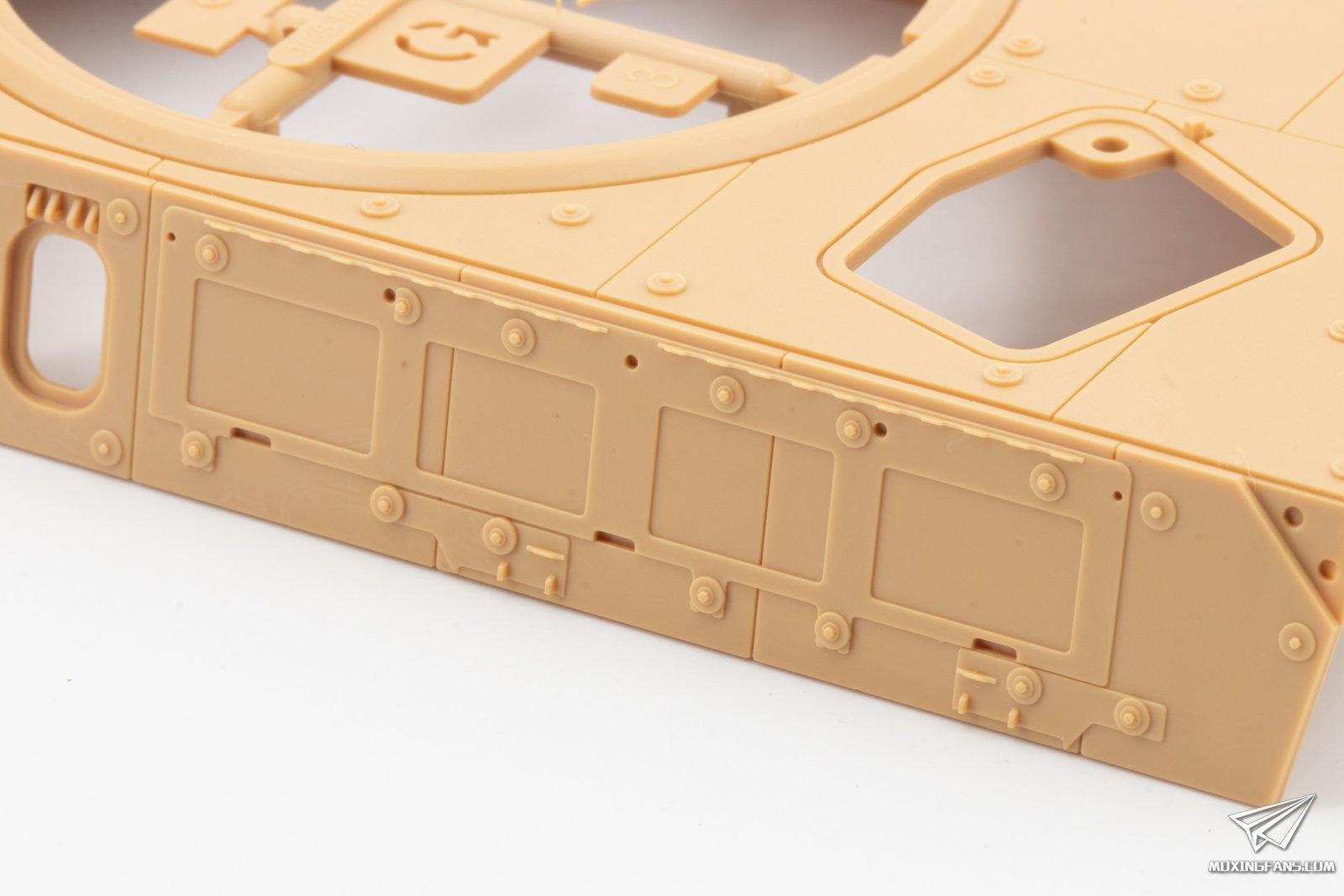 ▼ 下车体和上车体的细节,斯崔克标志性的大型螺栓开模比较工整,斜面上的螺栓头有轻微变形,但是并不严重,完全可以结束,装甲表面开出了细腻的防滑纹细节。